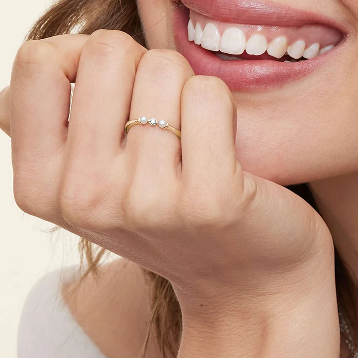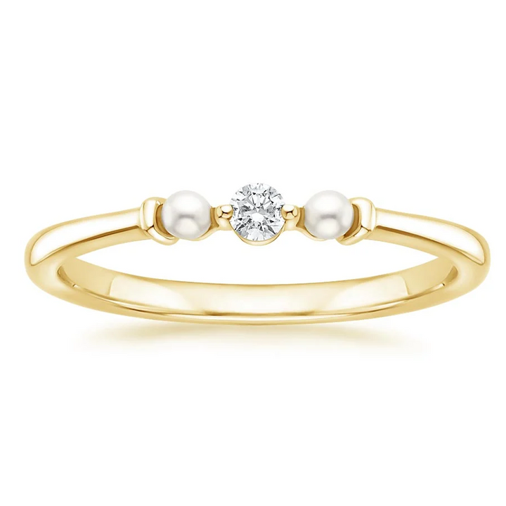 18K gold ring featuring a 0.06-carat round lab-created diamond (F/G color, SI1 clarity, 3EX cut) with two 2.5 mm round cultured pearls. Customizable engraving available.
