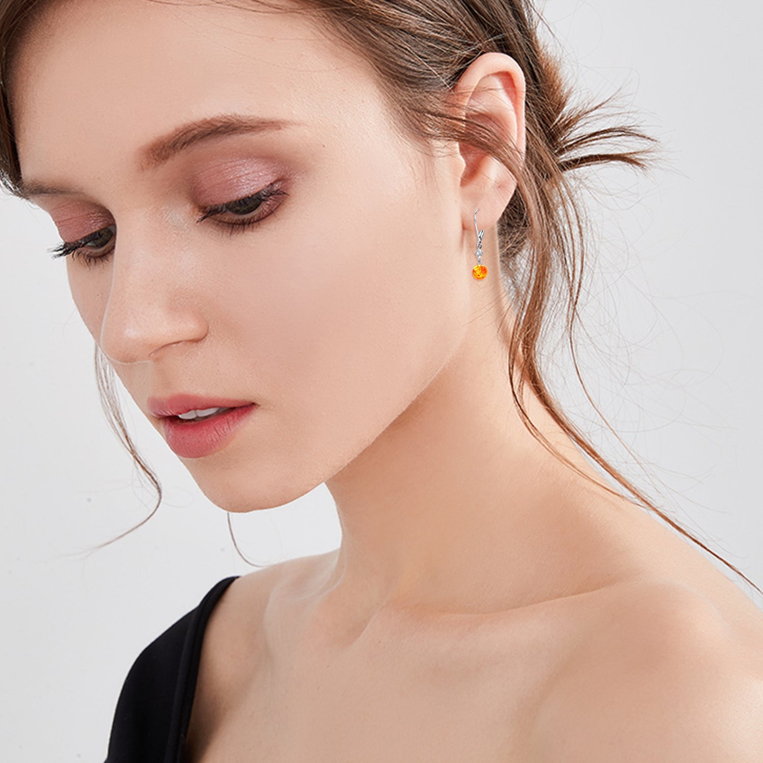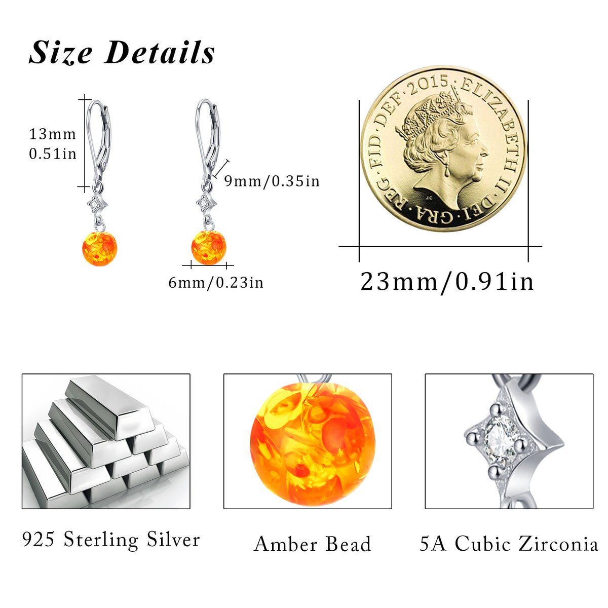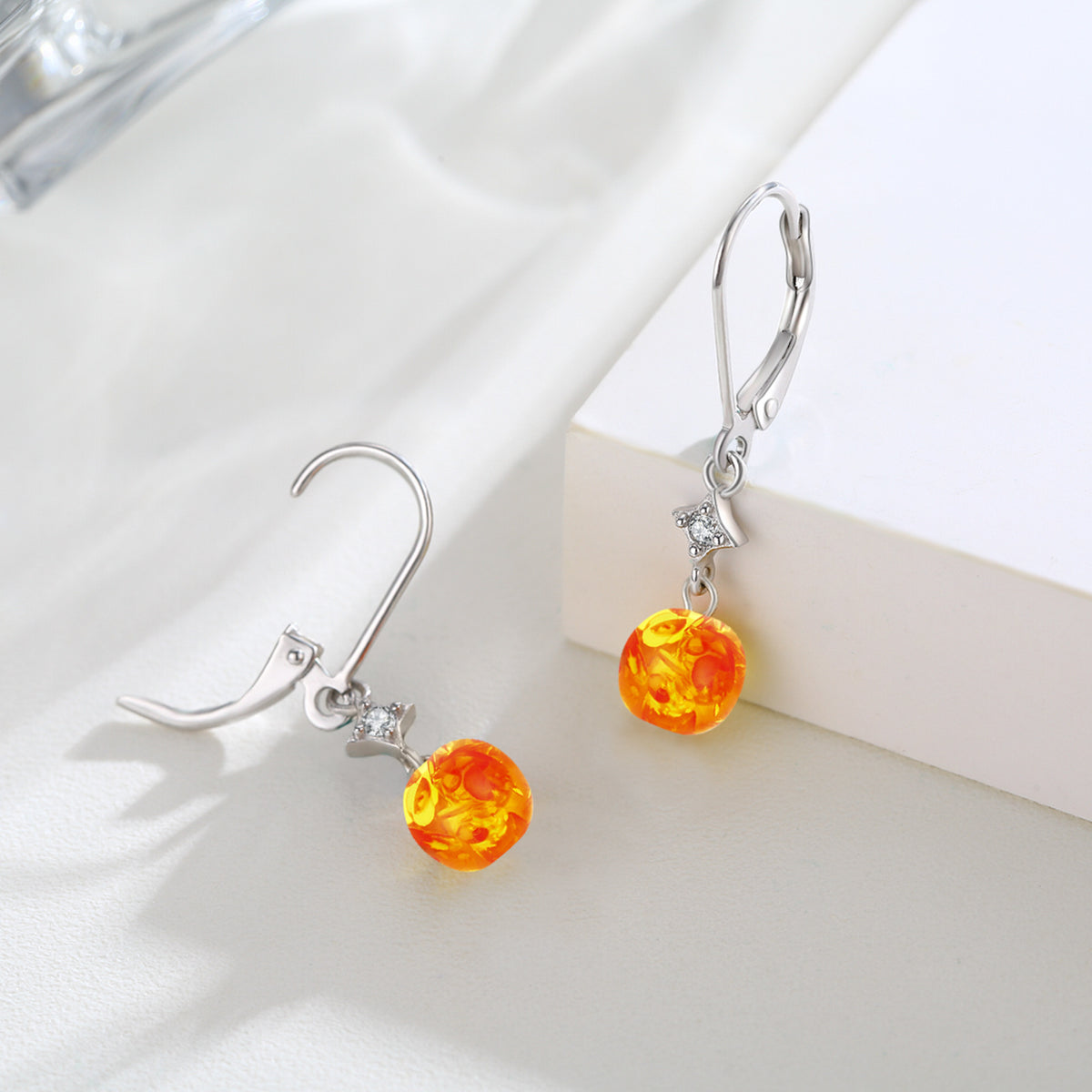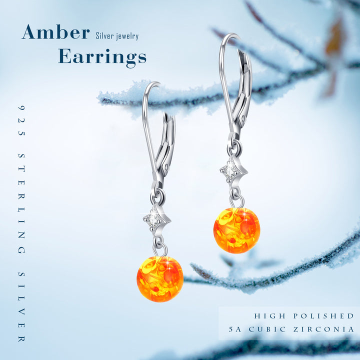 Crafted from Sterling Silver and White Gold Plated, these Lever-back Earrings feature Amber stones and Cubic Zirconia in Star and Round designs.