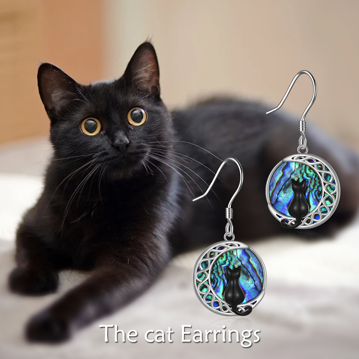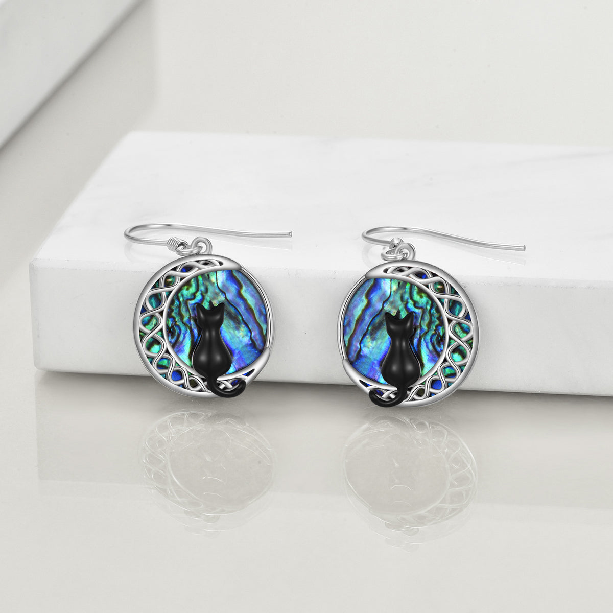 Sterling silver; white-gold plating; abalone shell; cat & moon motifs; drop earring design.
