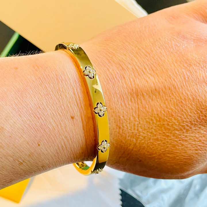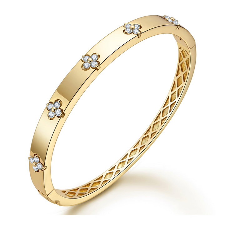 Sterling Silver with Yellow Gold Plated Moissanite Four Leaf Clover Plain Bangle Bracelet