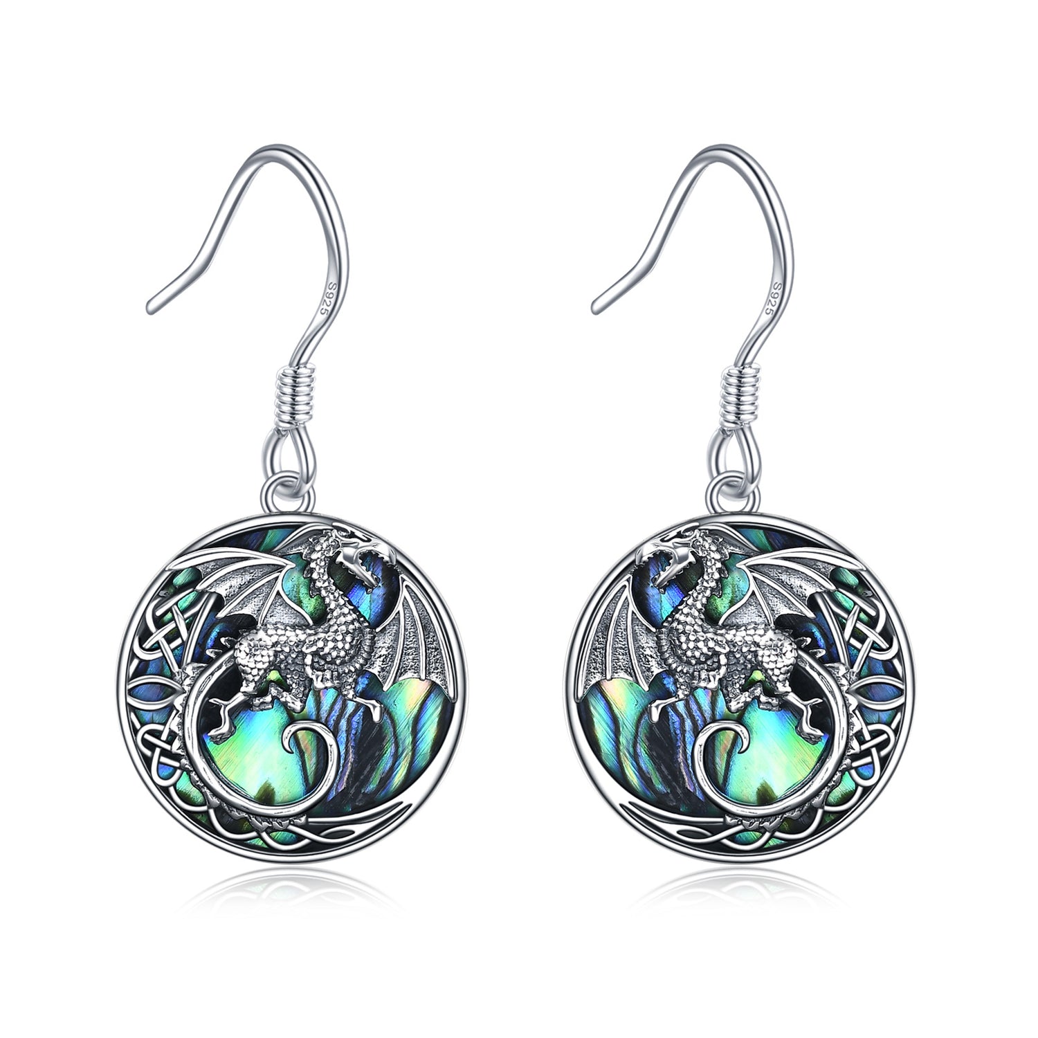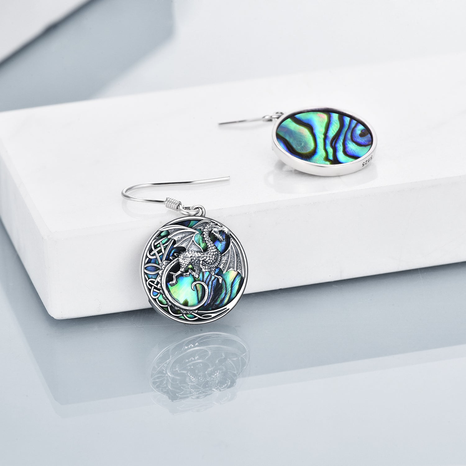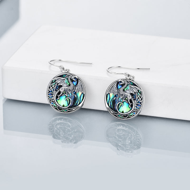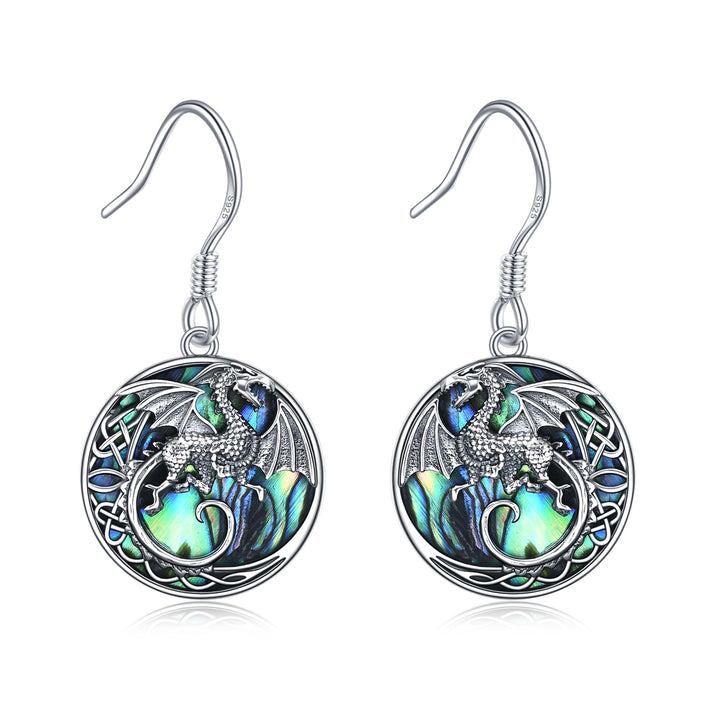 Crafted from Sterling Silver, these drop earrings feature Dragon and Celtic Knot motifs with a colorful Abalone Shellfish inlay.