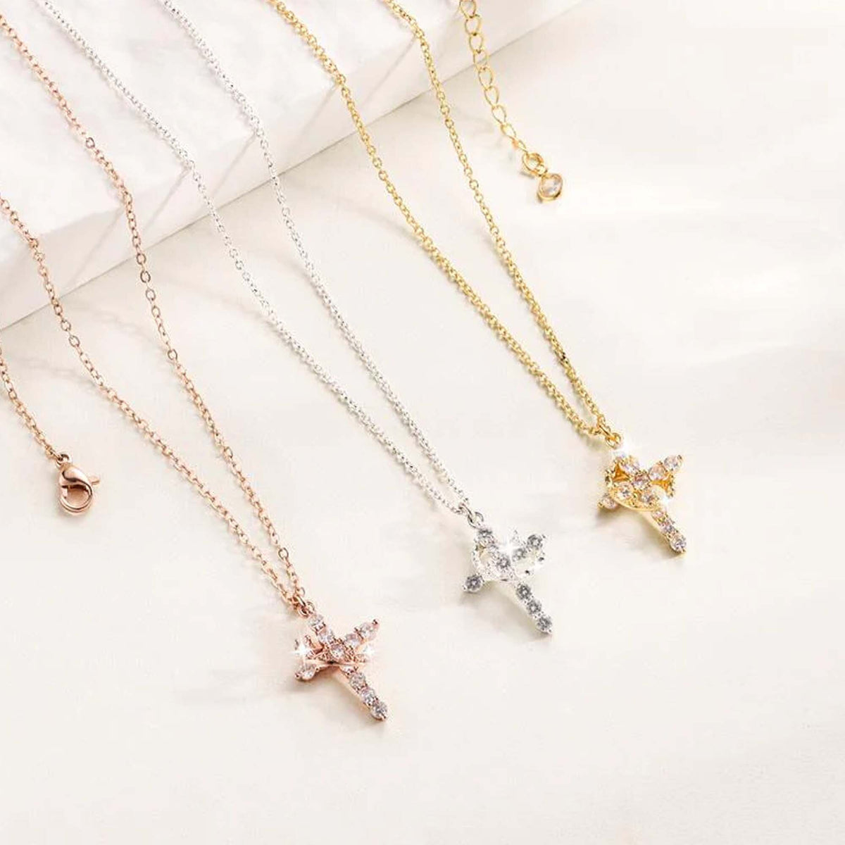 Crafted from 925 sterling silver with rose gold plating. Features a cross and crown pendant set with cubic zirconia. Includes a double-layer cable chain with a 2-inch extension.
