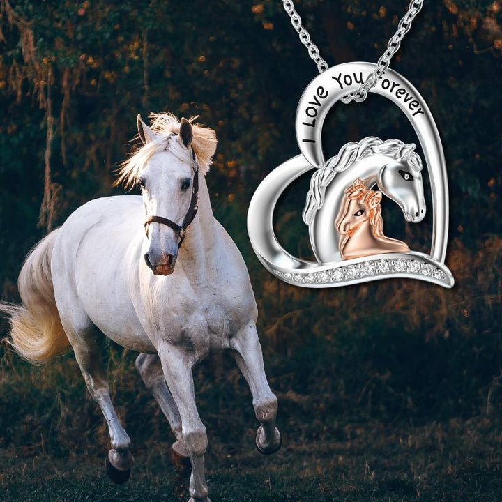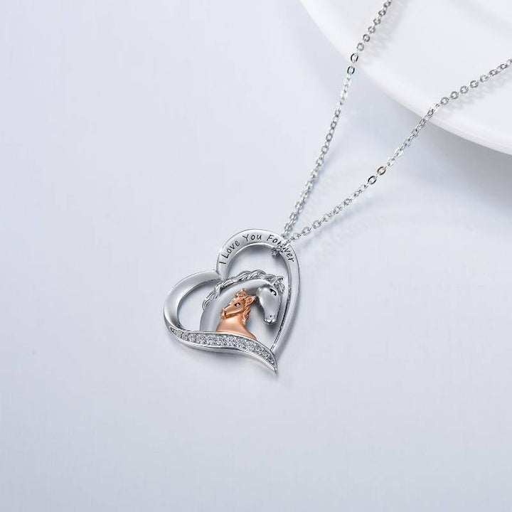 Crafted from high-quality Sterling Silver, this round pendant features a Horse and Heart motif, is embellished with white Cubic Zirconia, is engraved with "I Love You Forever," and is finished in a Two-tone Silver and Rose Gold treatment.