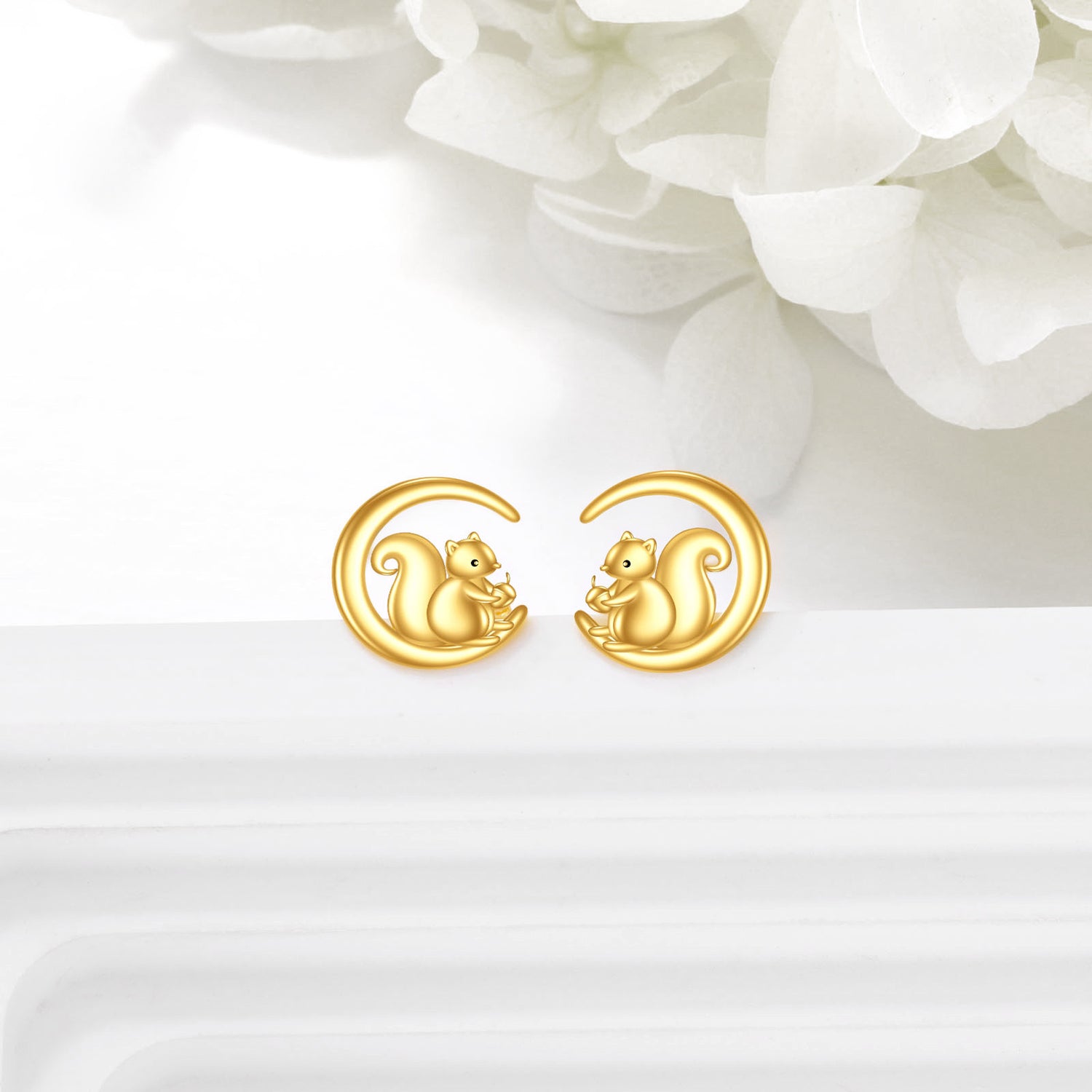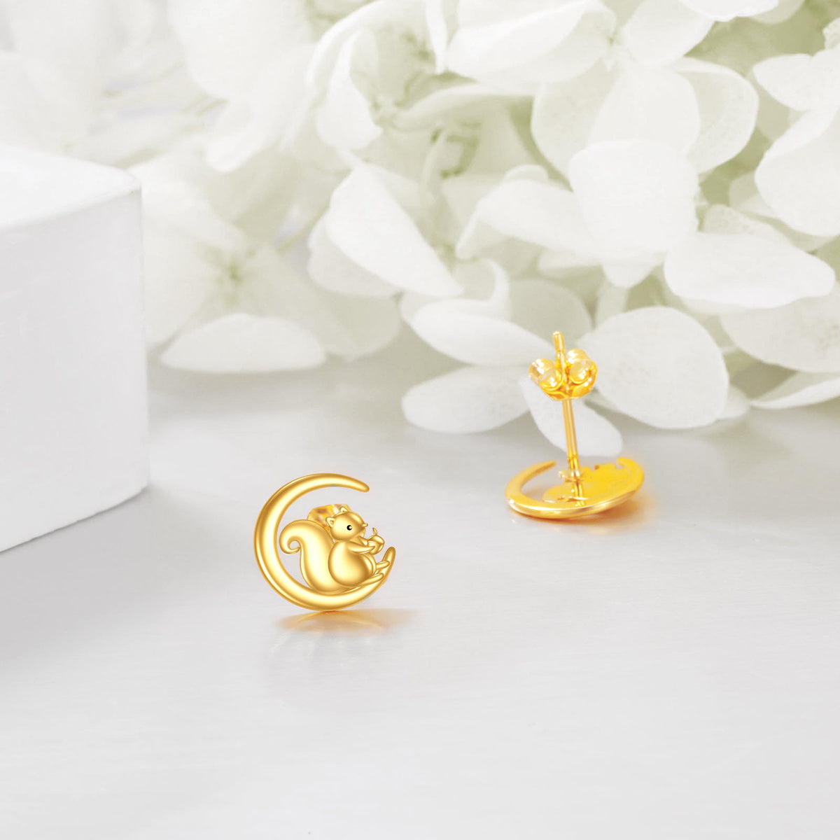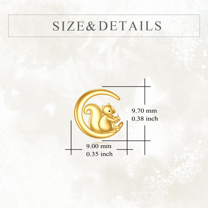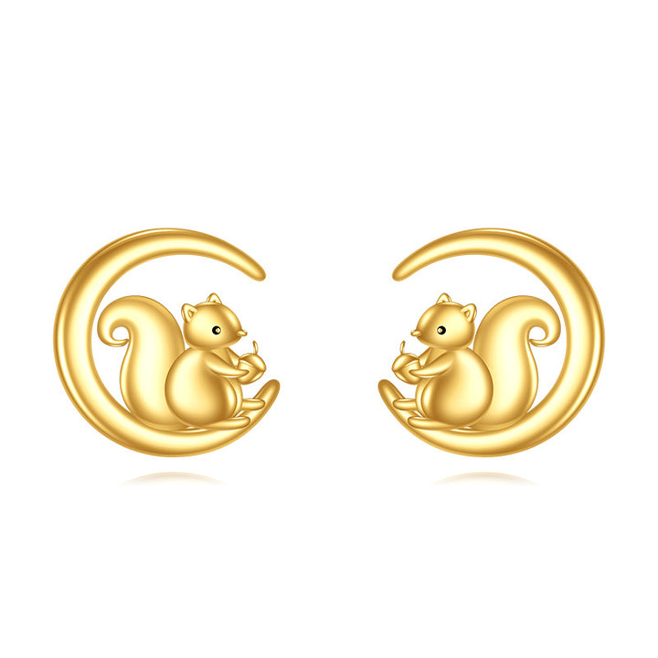Crafted from 14K Gold, featuring Stone-Free Stud Earrings with Squirrel and Moon Motifs.
