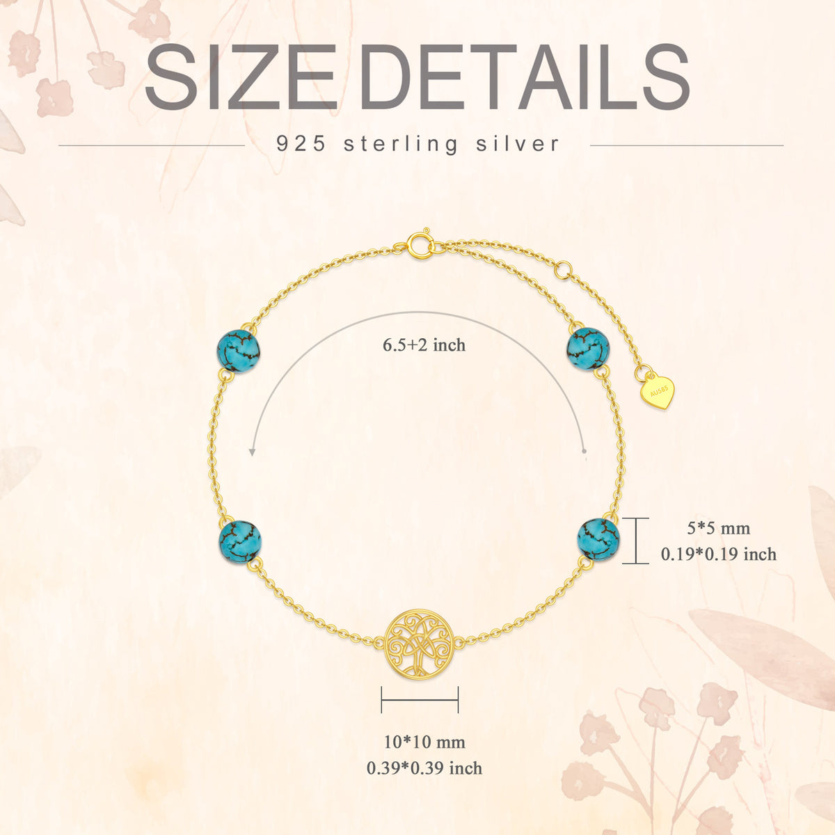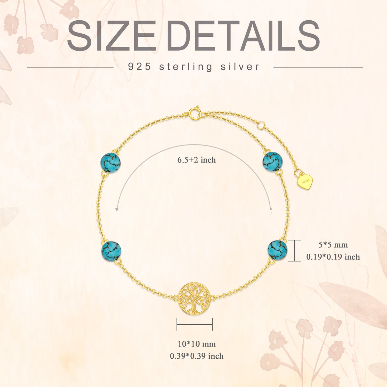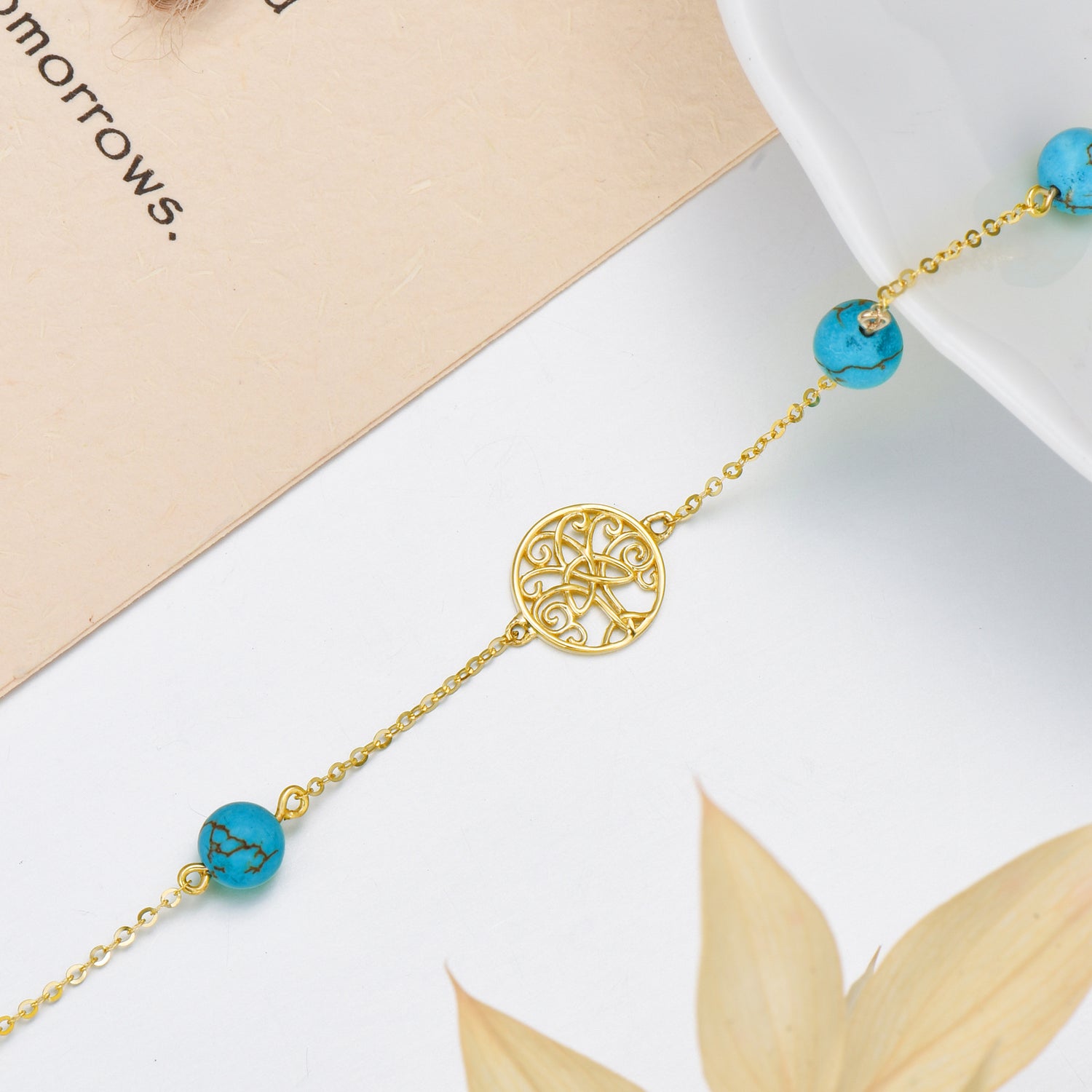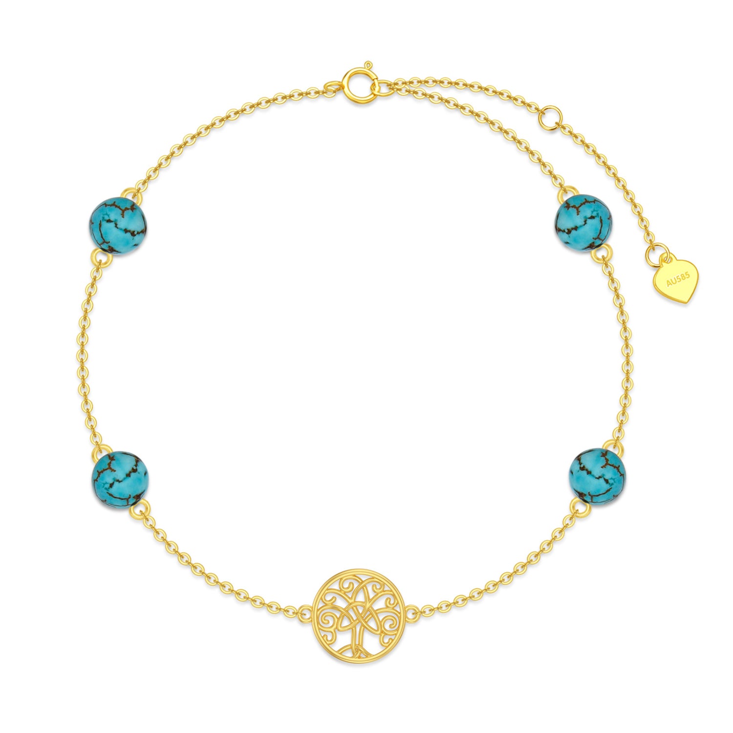 Crafted from solid 14K gold featuring turquoise stones and a Tree of Life charm.