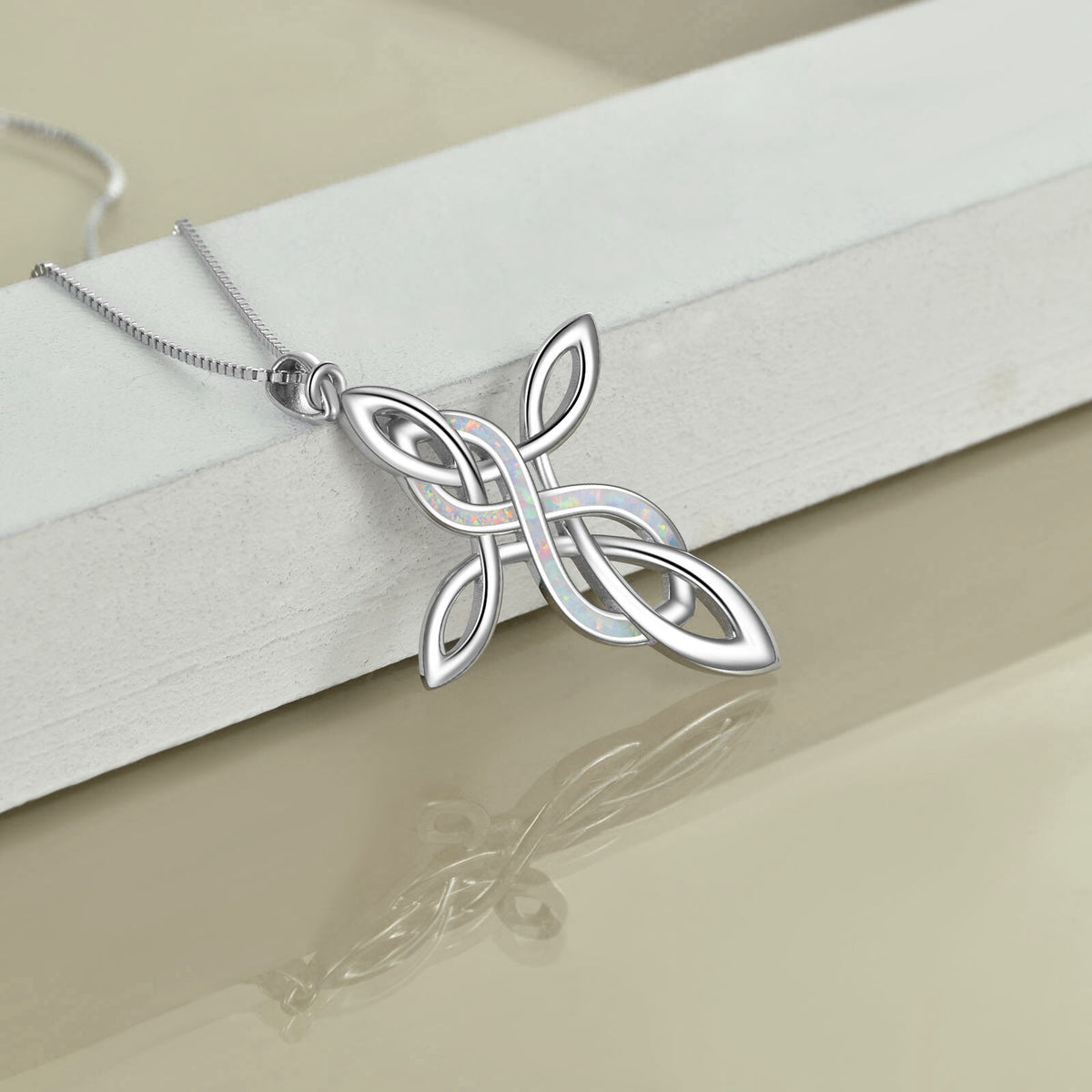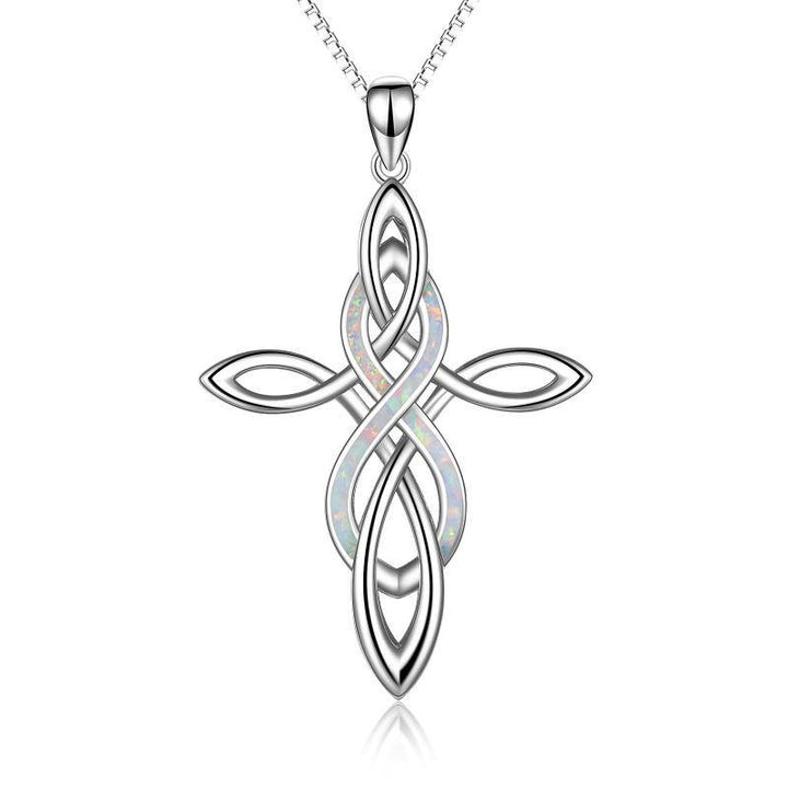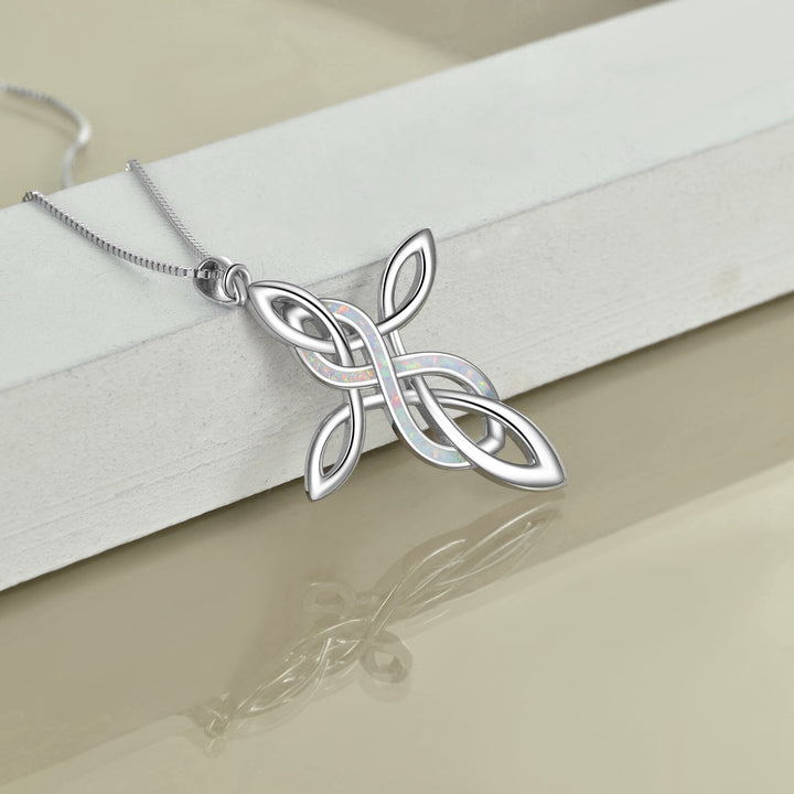 This Women's Pendant Necklace is crafted from Sterling Silver with White Gold Plating, Featuring a Shimmering White Opal, Celtic Knot Cross, and Infinity Symbol.