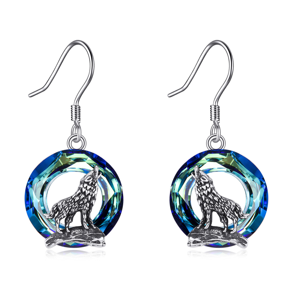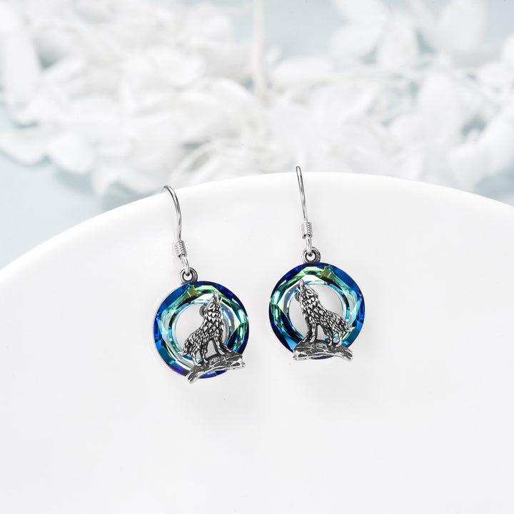 Sterling Silver Circular Shaped Crystal Wolf Drop Earrings
