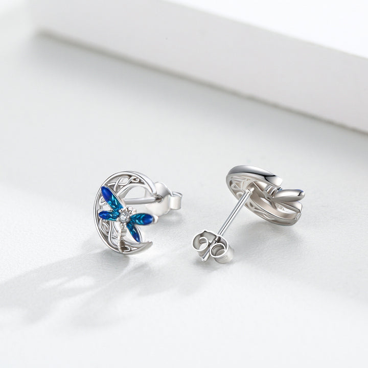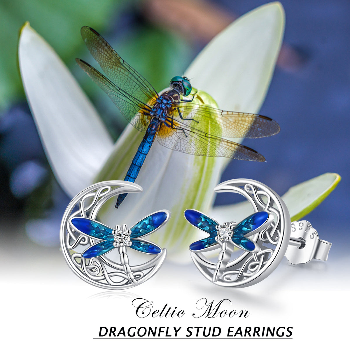 Sterling Silver Circular Cubic Zirconia Dragonfly & Celtic Knot With Moon Stud Earrings For Women