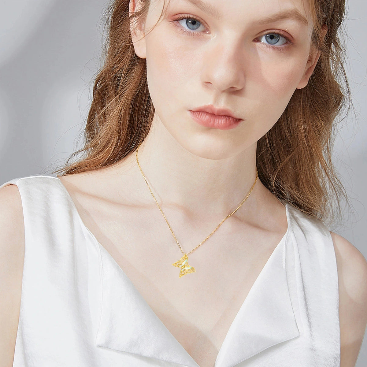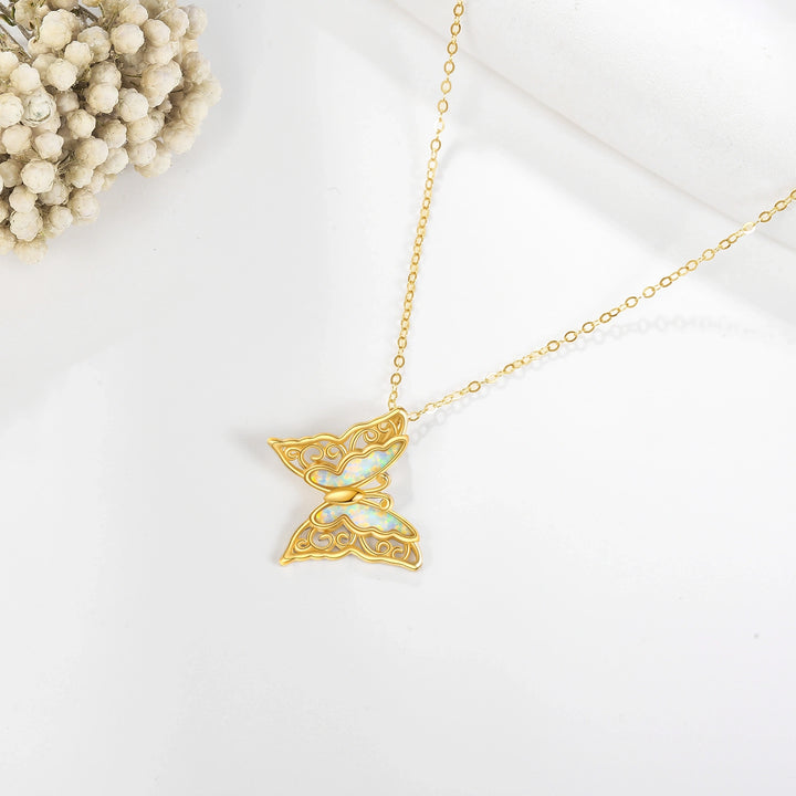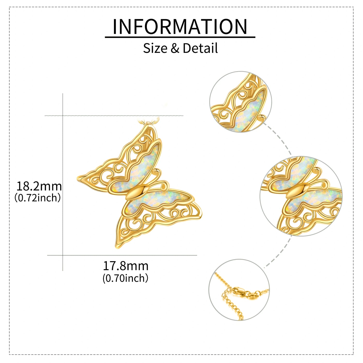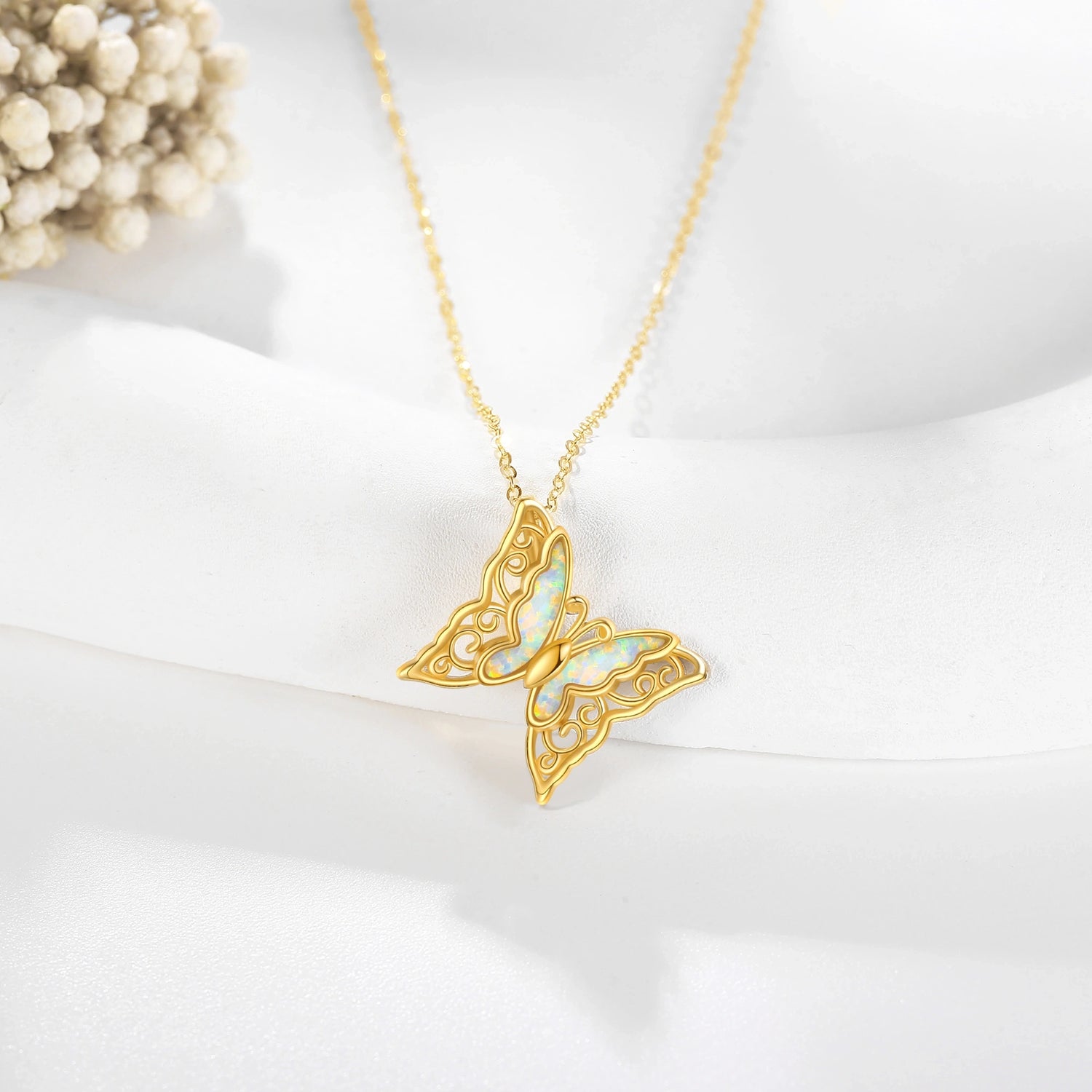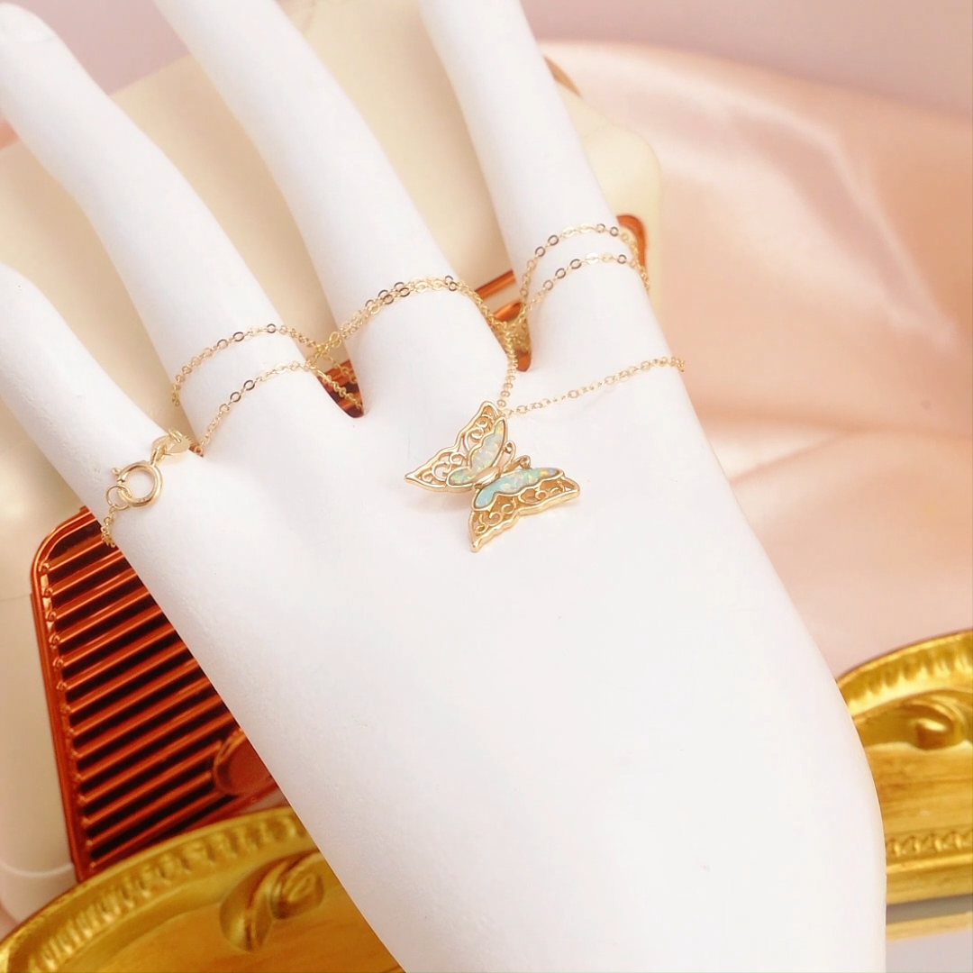 This 14K Gold Opal Butterfly Pendant Necklace by YFN elevates elegance with its enchanting design, symbolizing the grace of transformation and rebirth. The delicate butterfly, a motif of effortless beauty, cradles a mesmerizing opal centerpiece that radiates a unique, shifting spectrum of color. Its luxurious 14K gold setting provides a warm, timeless foundation, making this necklace a versatile and sophisticated statement piece. It seamlessly enhances both casual daywear and formal evening attire, embodying a truly captivating and feminine charm.