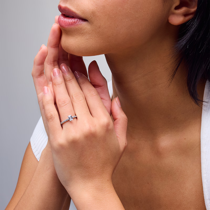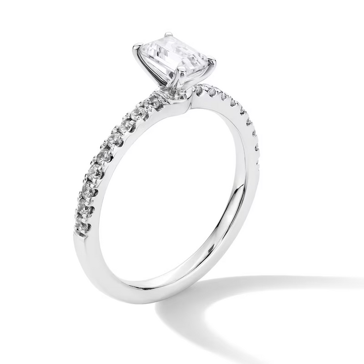 This sidestone engagement ring is crafted from 14K solid white gold. It features a lab-created diamond (D color, VVS1-VS1 clarity) with a total weight of 1.25 to 3.75 CT. T.W. (center stone 0.5 to 3 CT), and emerald accents. It is IGI Certified (3EX polish/cut/symmetry) and offers personalization.