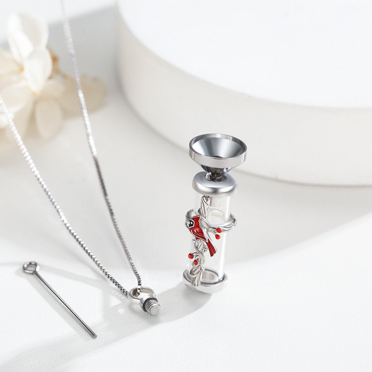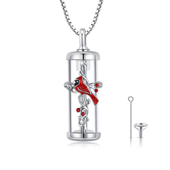 Sterling Silver Cardinal & Cross Urn Necklace for Ashes