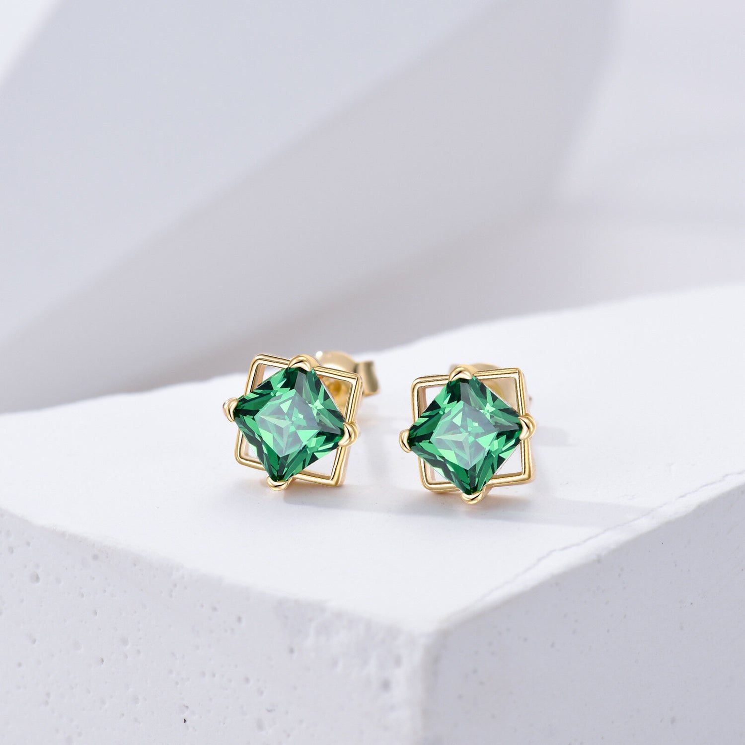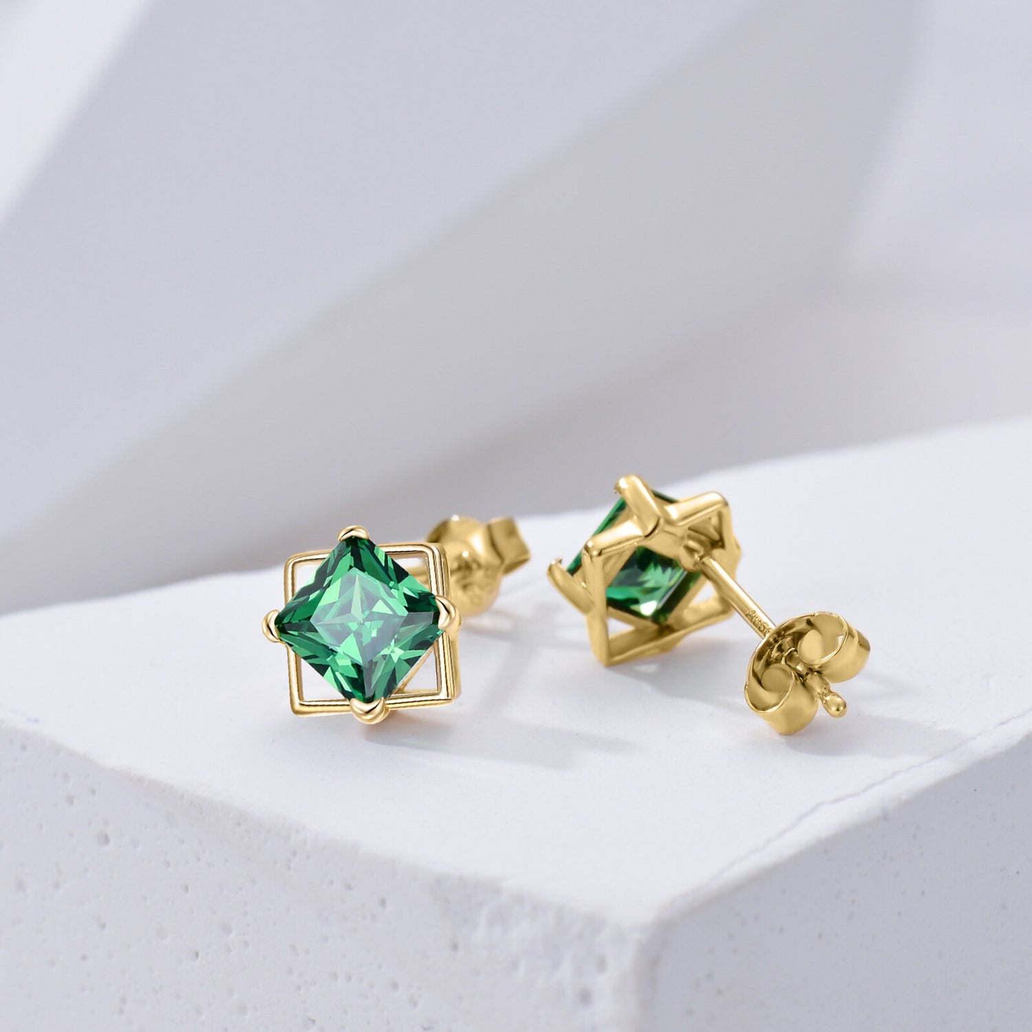 These Square Stud Earrings are crafted from High-Quality 14K Gold, featuring Princess-Square Shaped Cubic Zirconia and a Dazzling Emerald accent.