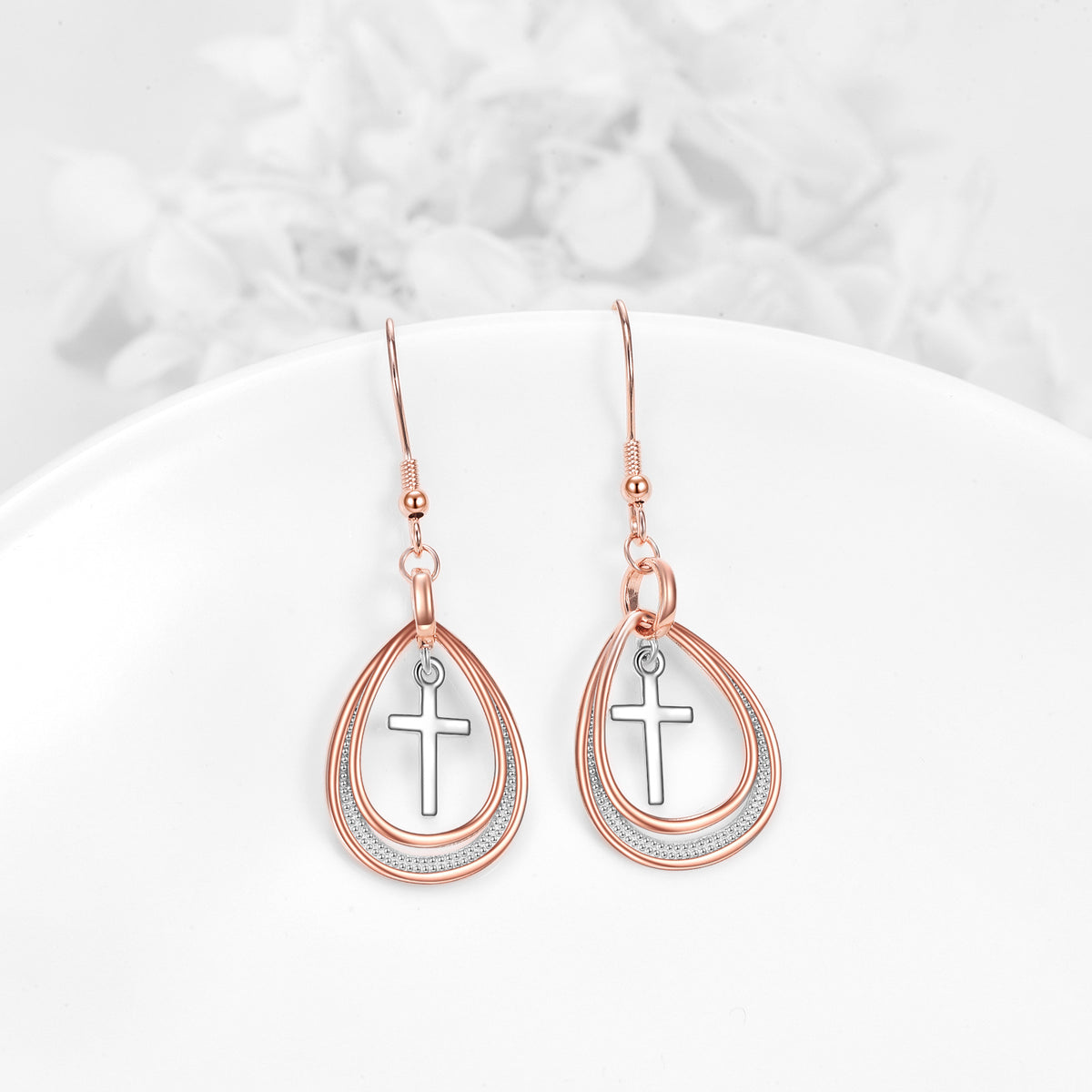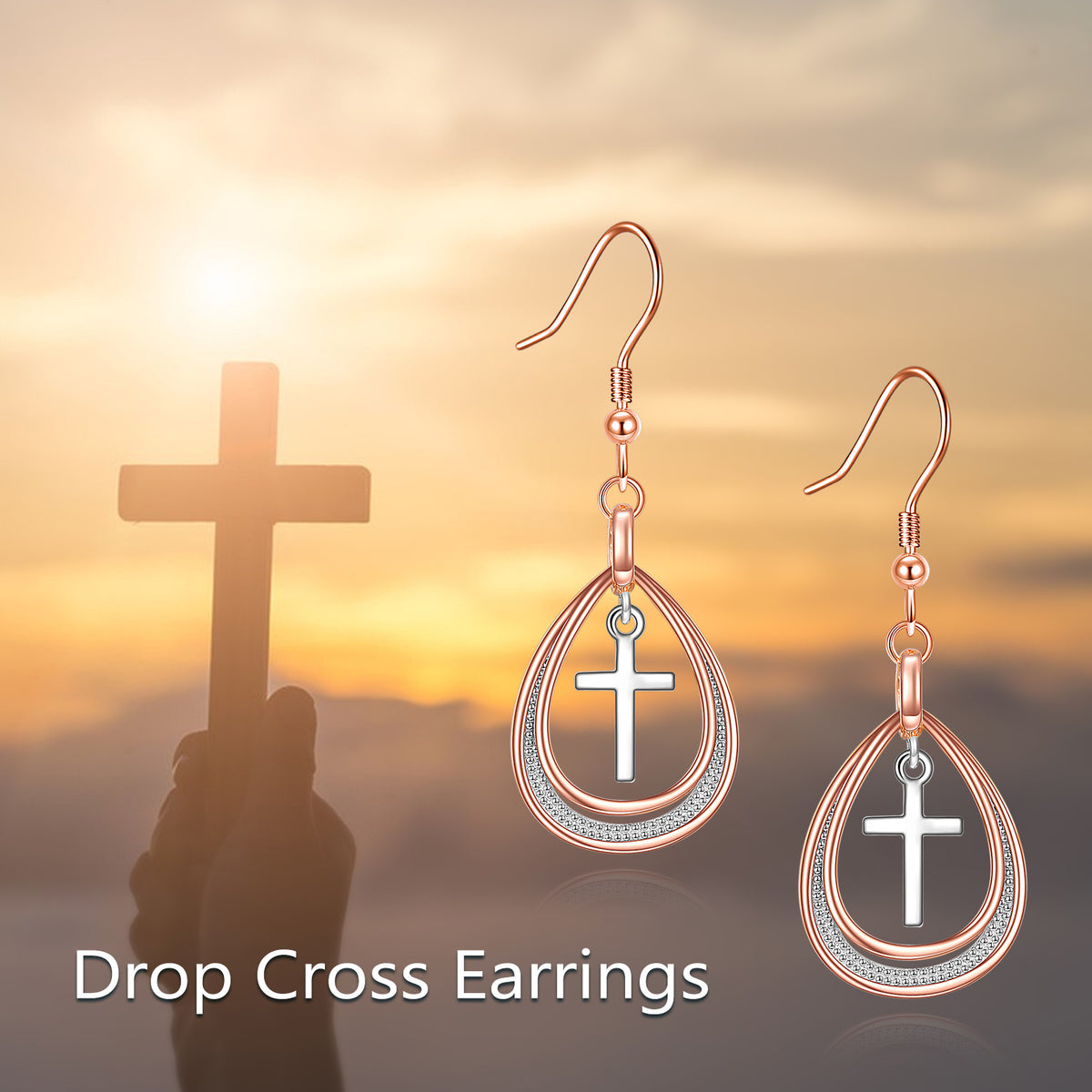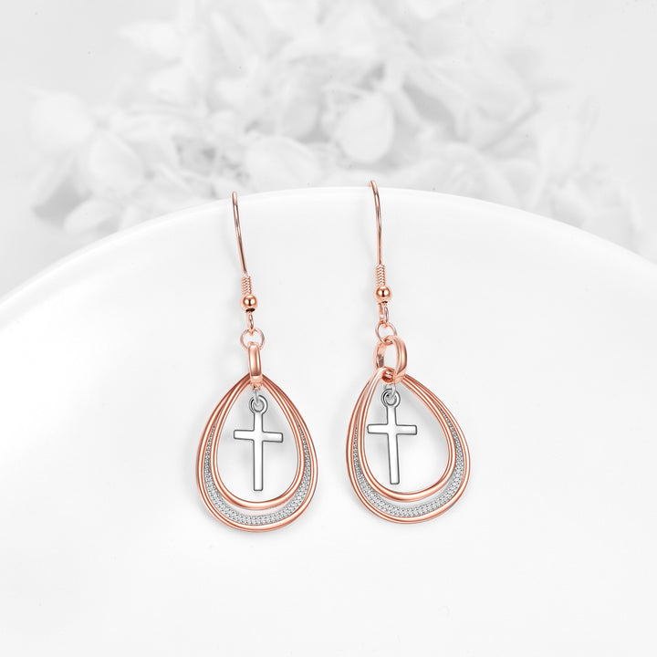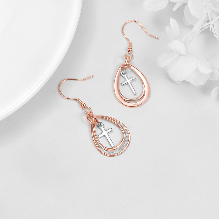 These drop earrings are crafted from Sterling Silver with Rose Gold accents for a two-tone finish, featuring a stone-free cross design and securing with hook-style backs.