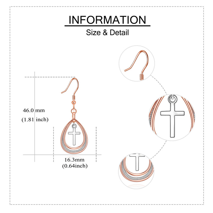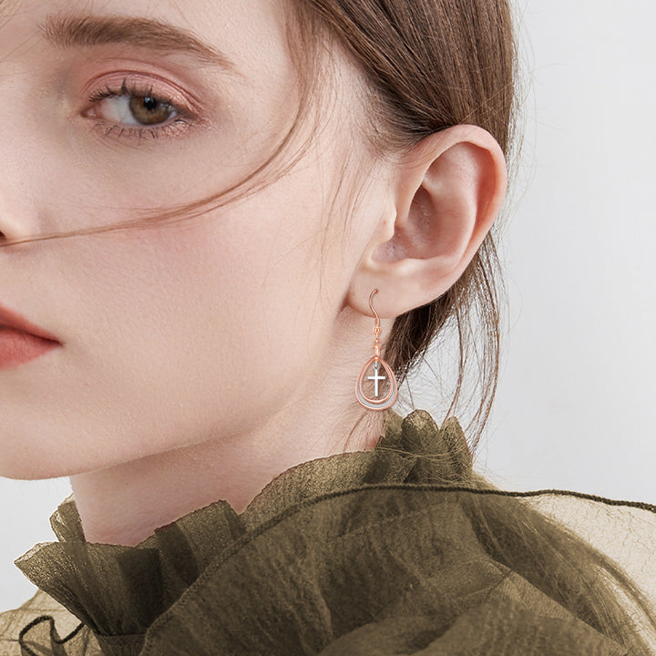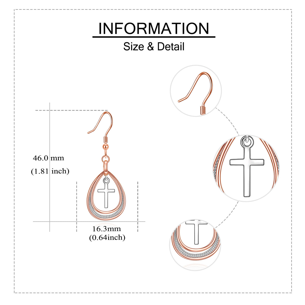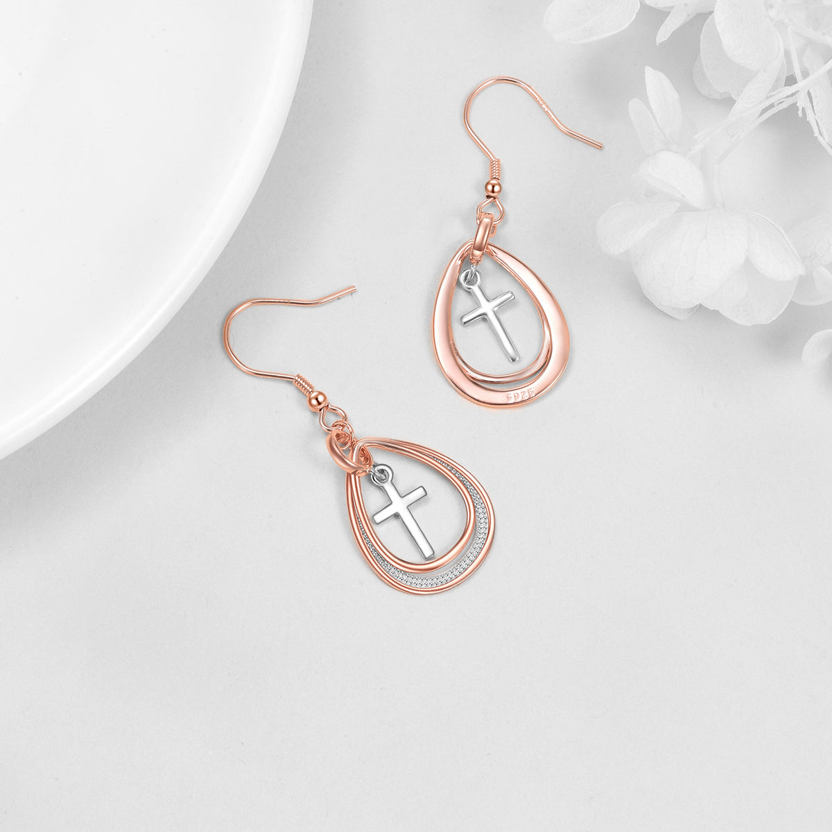 These drop earrings are crafted from Sterling Silver with Rose Gold accents for a two-tone finish, featuring a stone-free cross design and securing with hook-style backs.