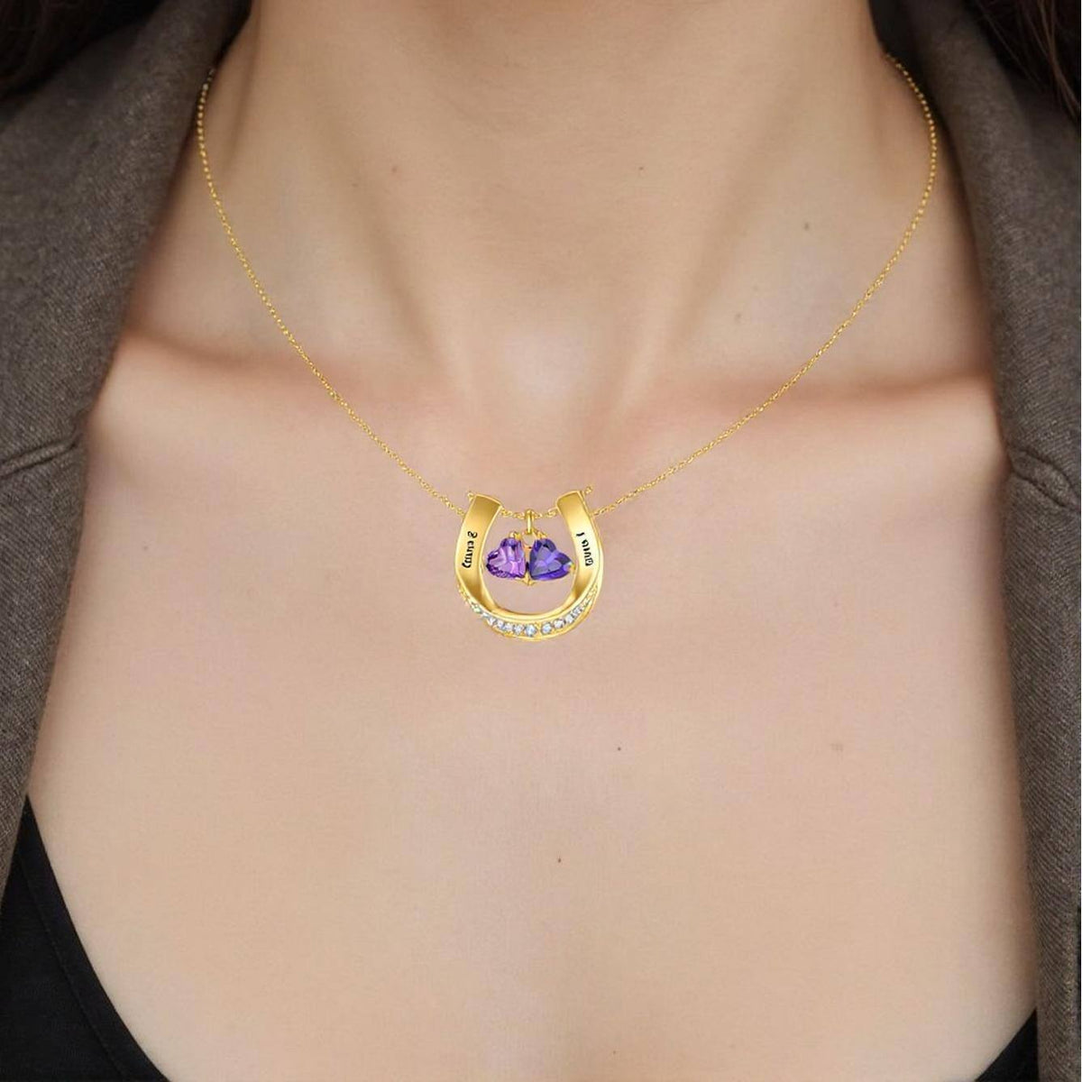 Crafted from 14K solid gold, this pendant features a heart shape adorned with cubic zirconia. It is customizable with a personalized birthstone and a classic name, and includes a horseshoe motif.