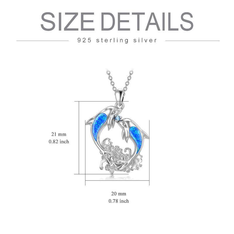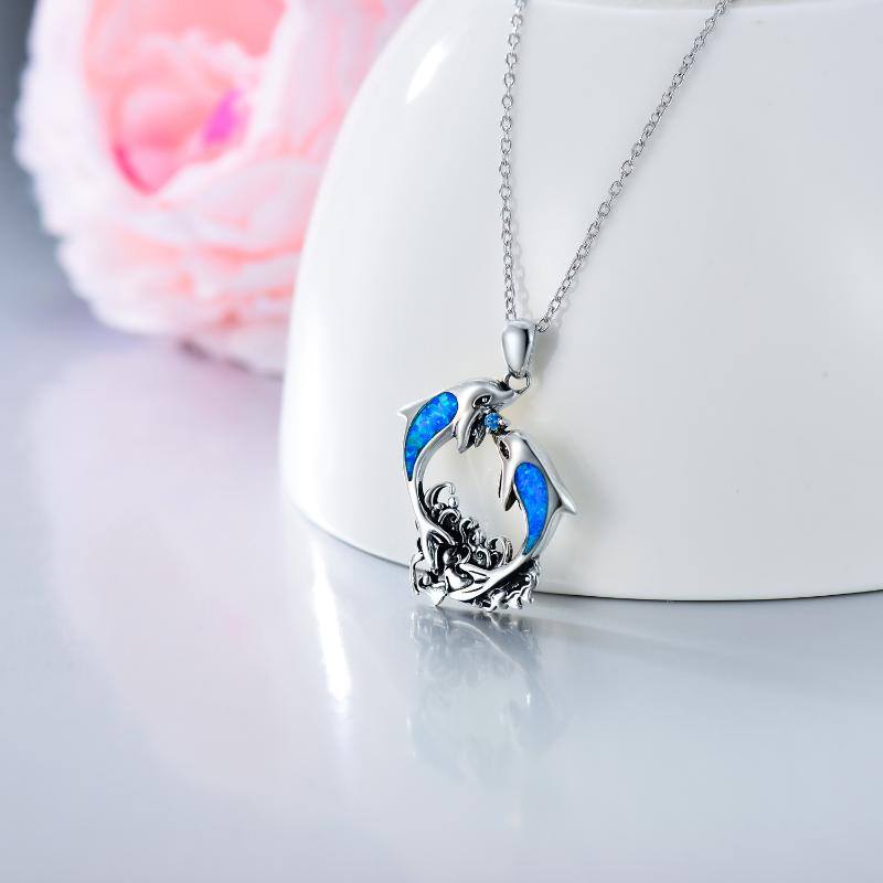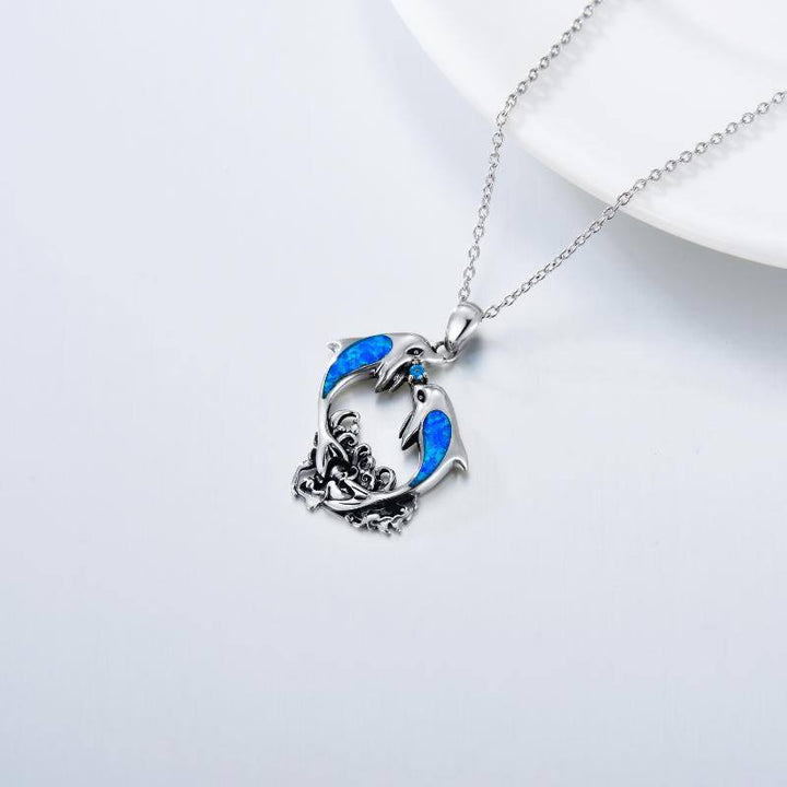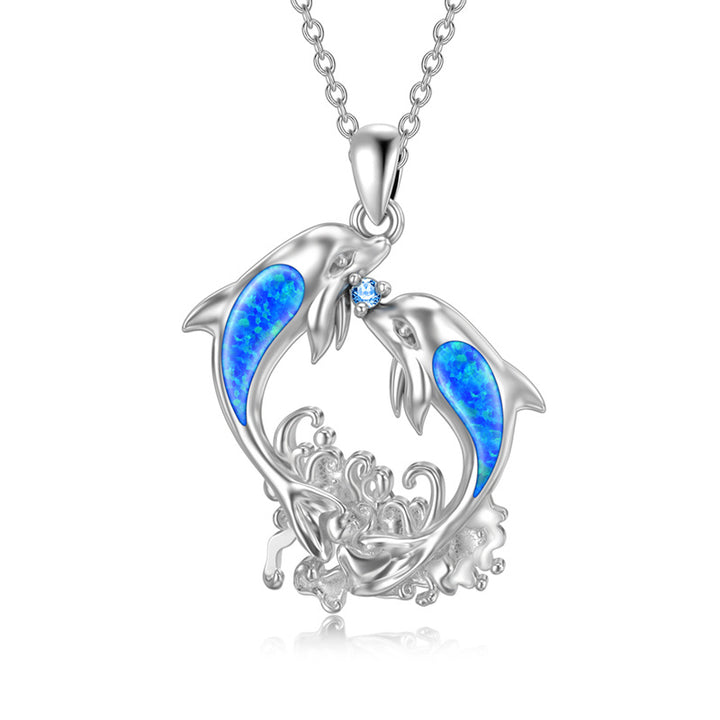 Sterling Silver Opal Dolphins Pendant Necklace