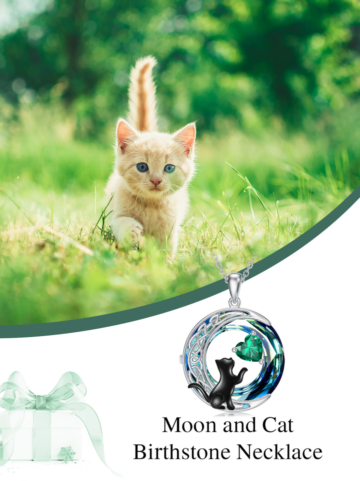 Sterling Silver Two-tone Cat & Celtic Knot & Moon Crystal Pendant Necklace
