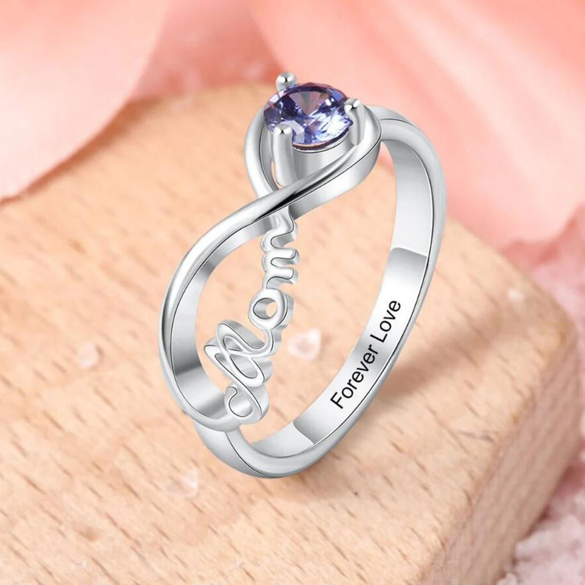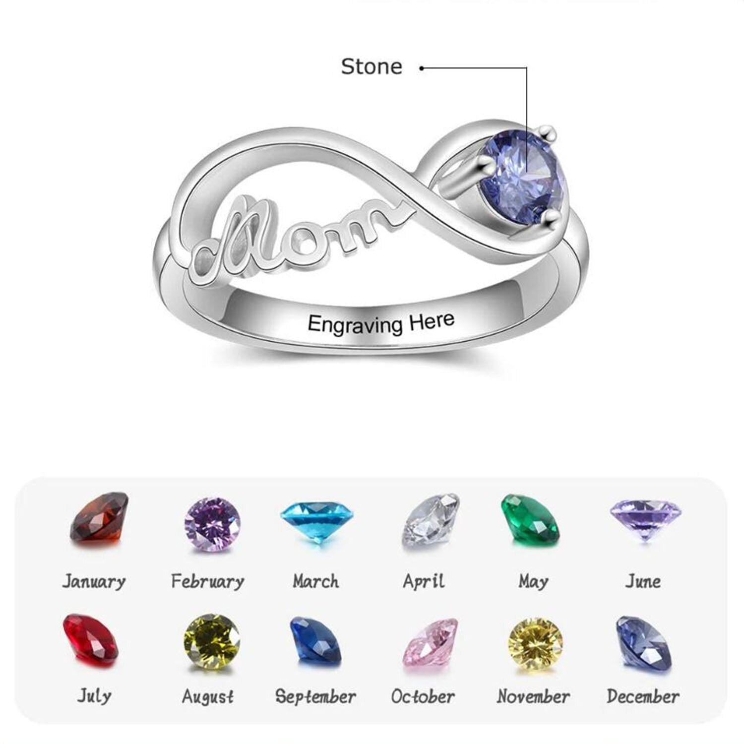 10K White Gold Personalized Birthstone With Engraving With Infinity Symbol Ring For Women
