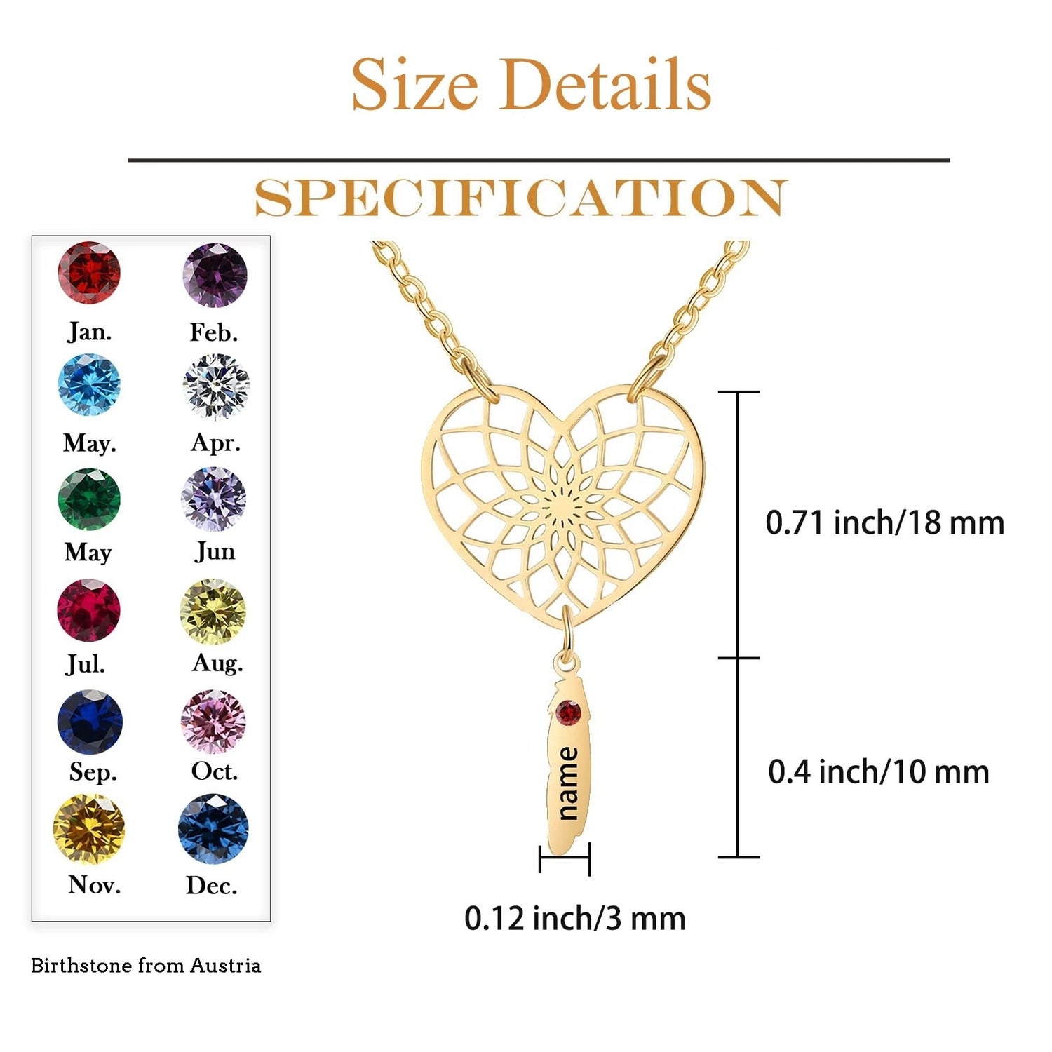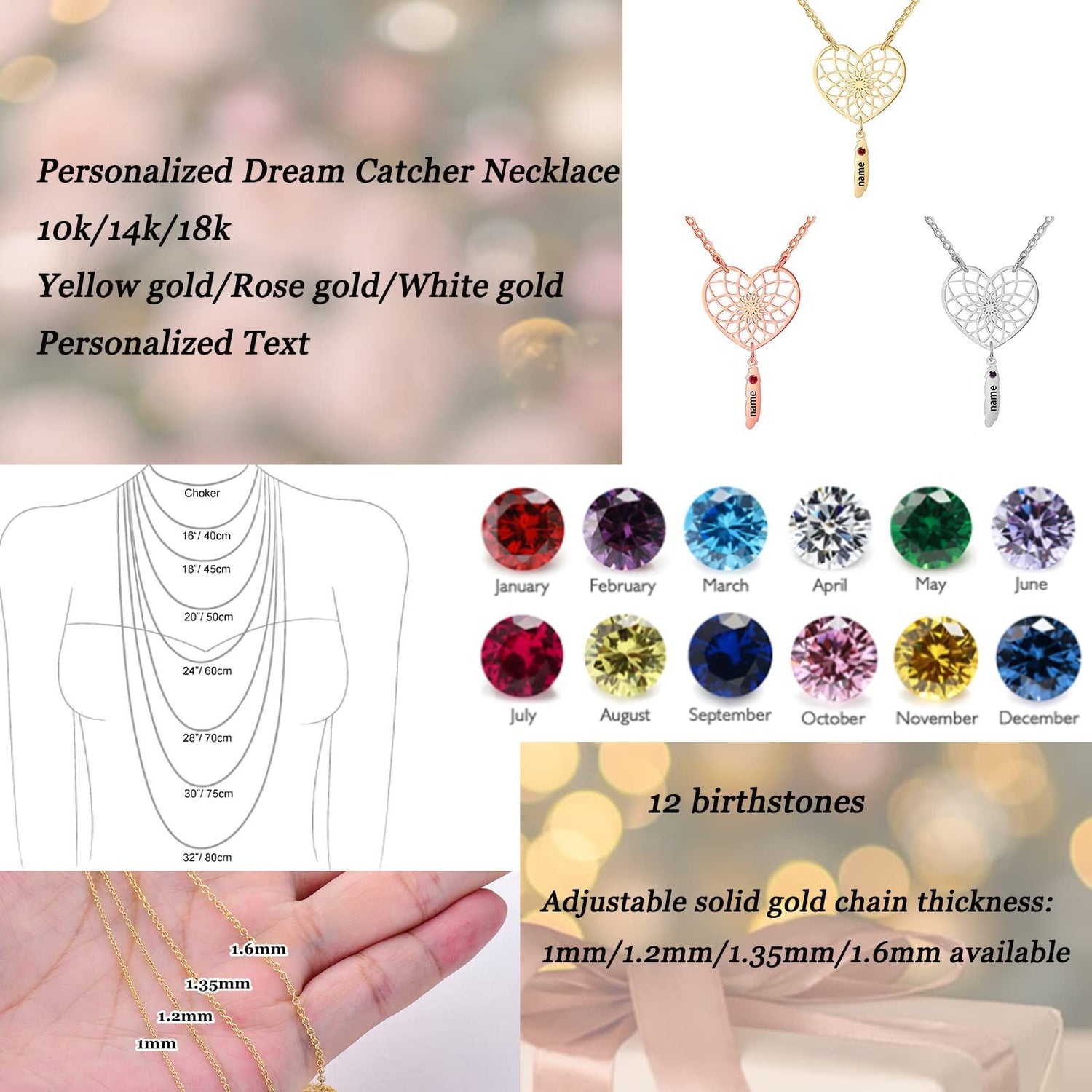 9K gold; cubic zirconia; personalized name engraving; personalized birthstone; heart and dream catcher motifs; gold chain.