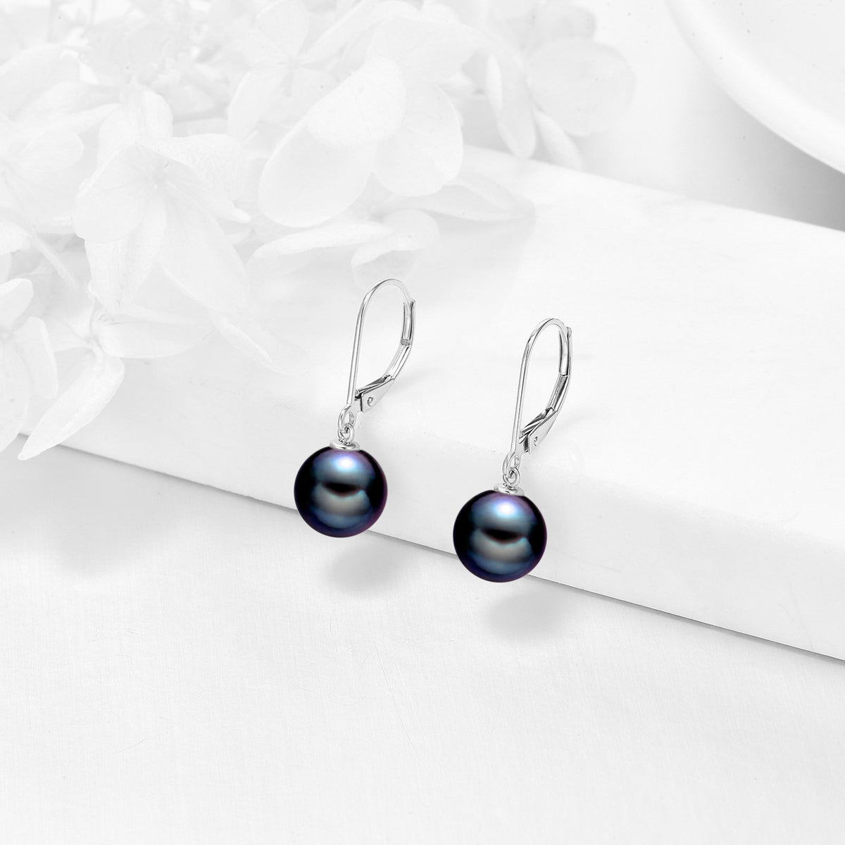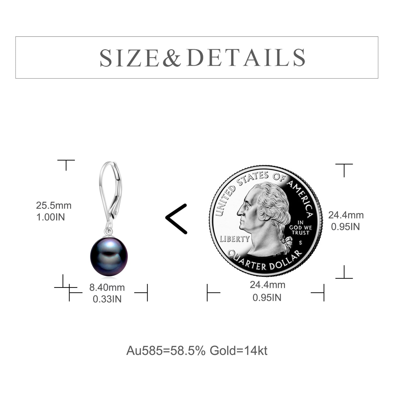 14K White Gold Circular Black Pearl Bead Lever-back Earrings