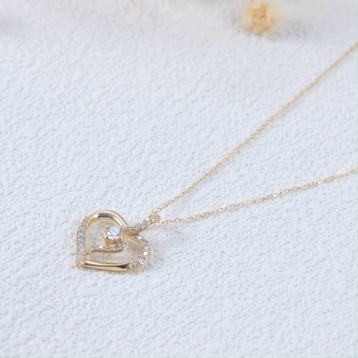 This Heart Pendant Necklace is crafted from High-Quality 9K Gold, featuring a Dazzling Heart-Shaped Moissanite and an 18-inch chain.