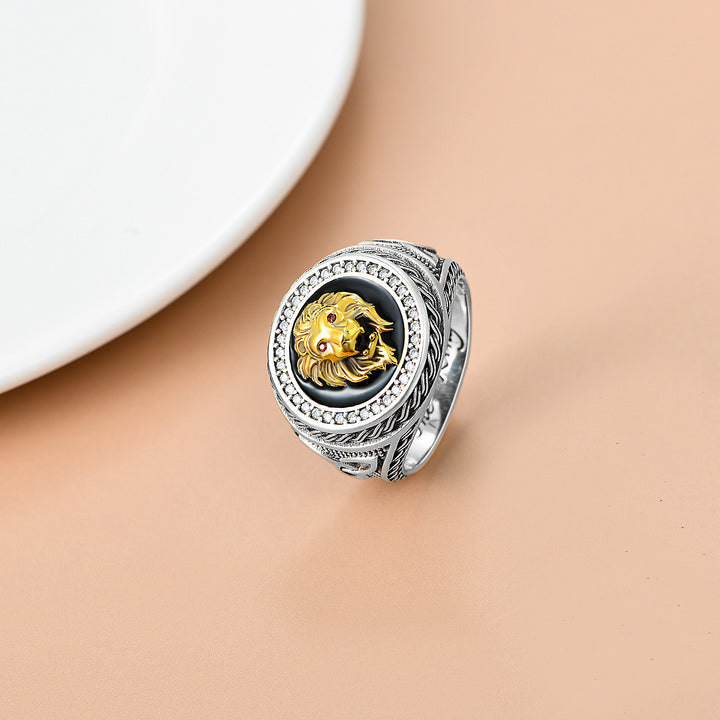 This Women's Signet Ring is crafted from Sterling Silver with Silver Oxide and Gold Tones (Two-tone), featuring a Majestic Lion motif adorned with Dazzling Cubic Zirconia stones.