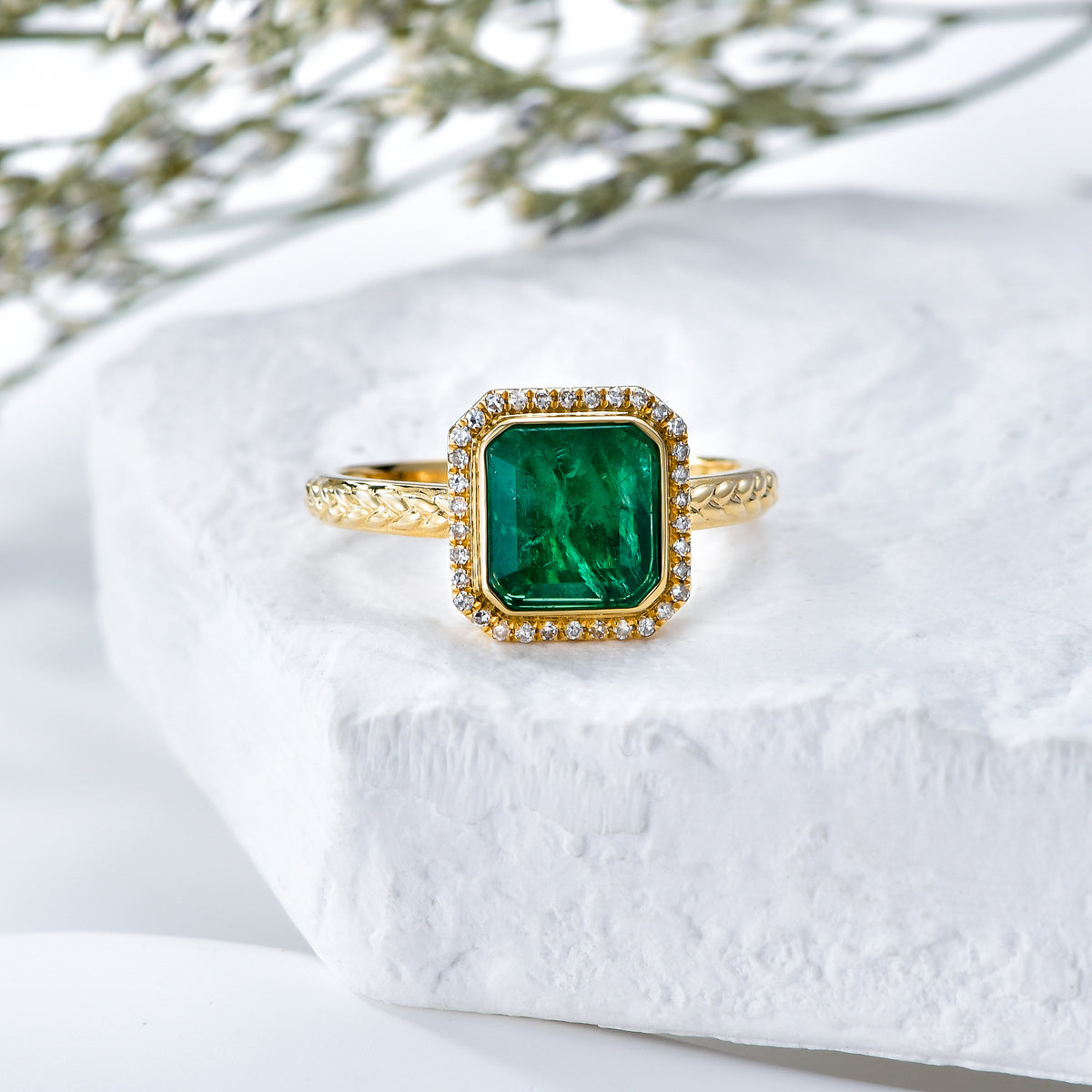 This engagement ring is crafted from luxurious 18K gold and features a princess-square shaped emerald center stone, ranging from 1 to 5 CT in total weight, with an EX cut, polish, and symmetry rating.