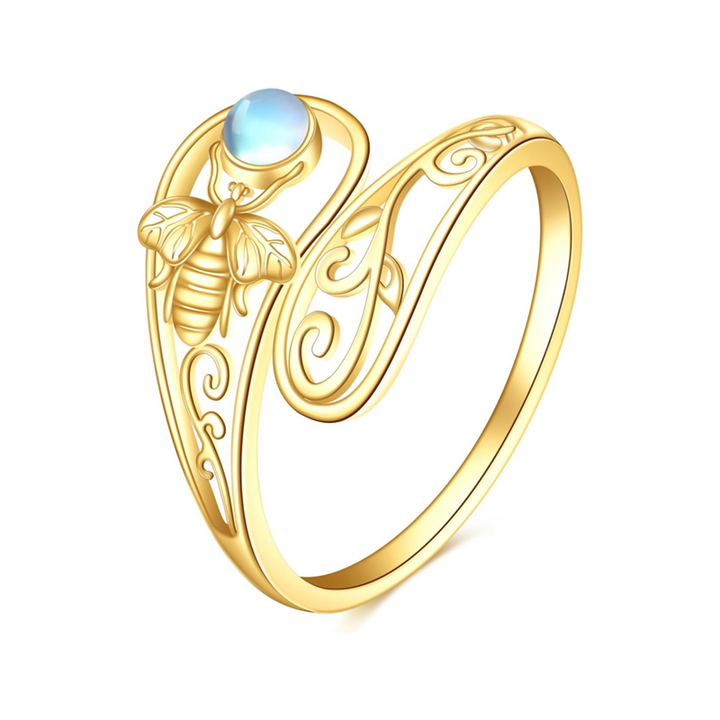 Crafted from solid 14K Gold. This is an Open Ring featuring Bee motif, set with Moonstone stone.