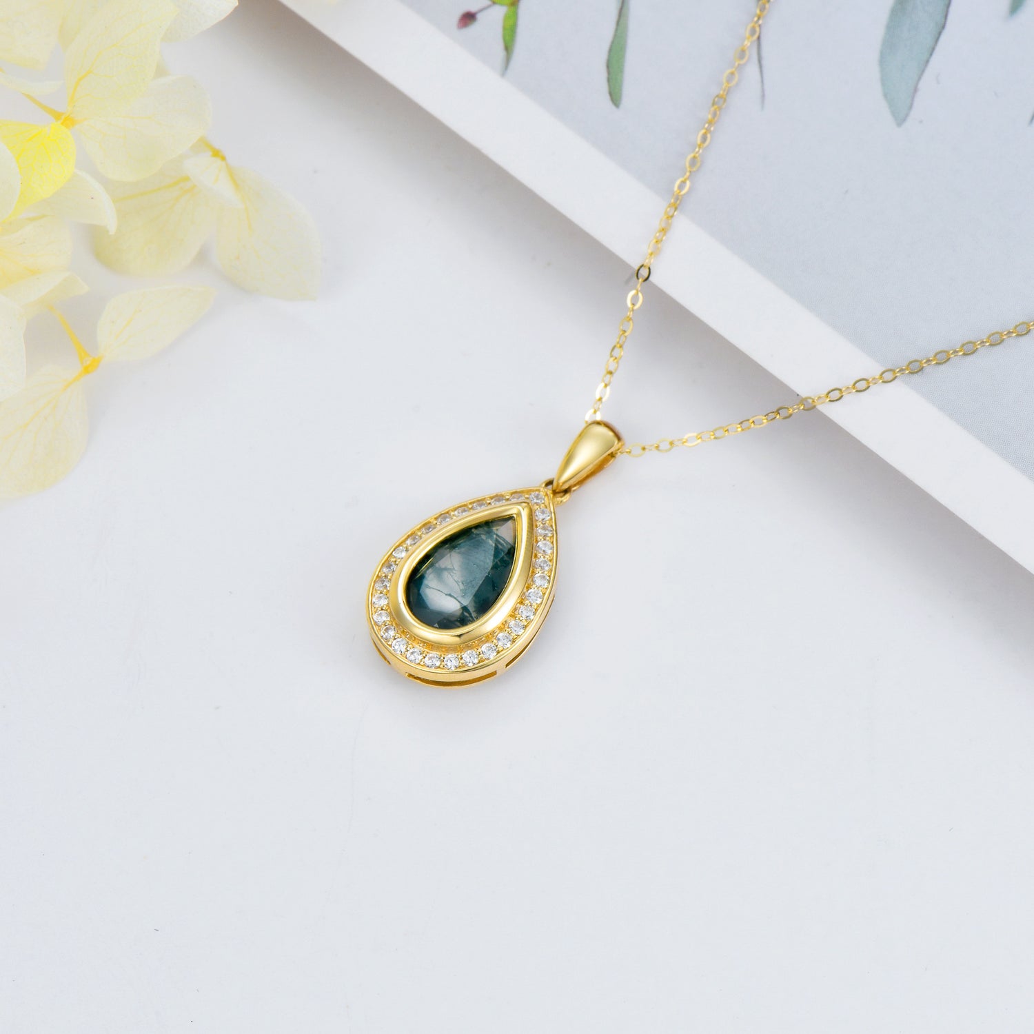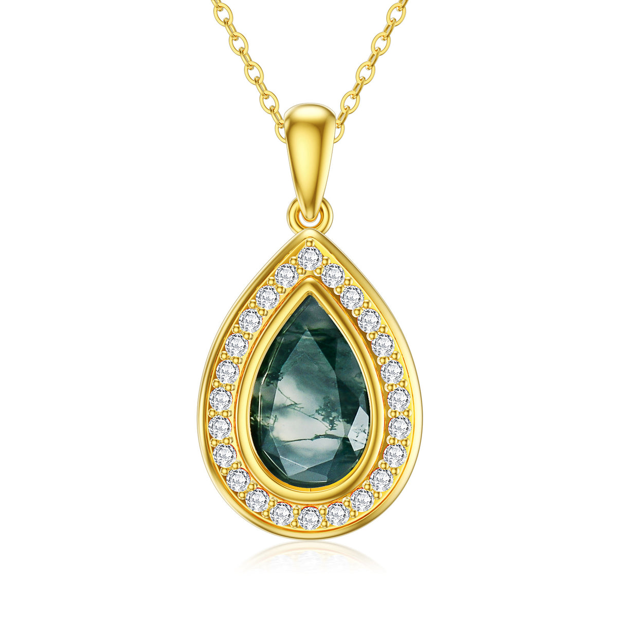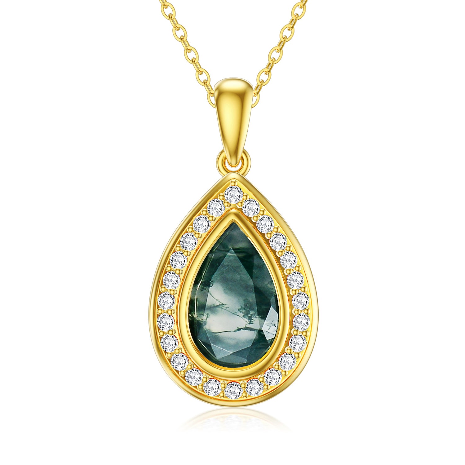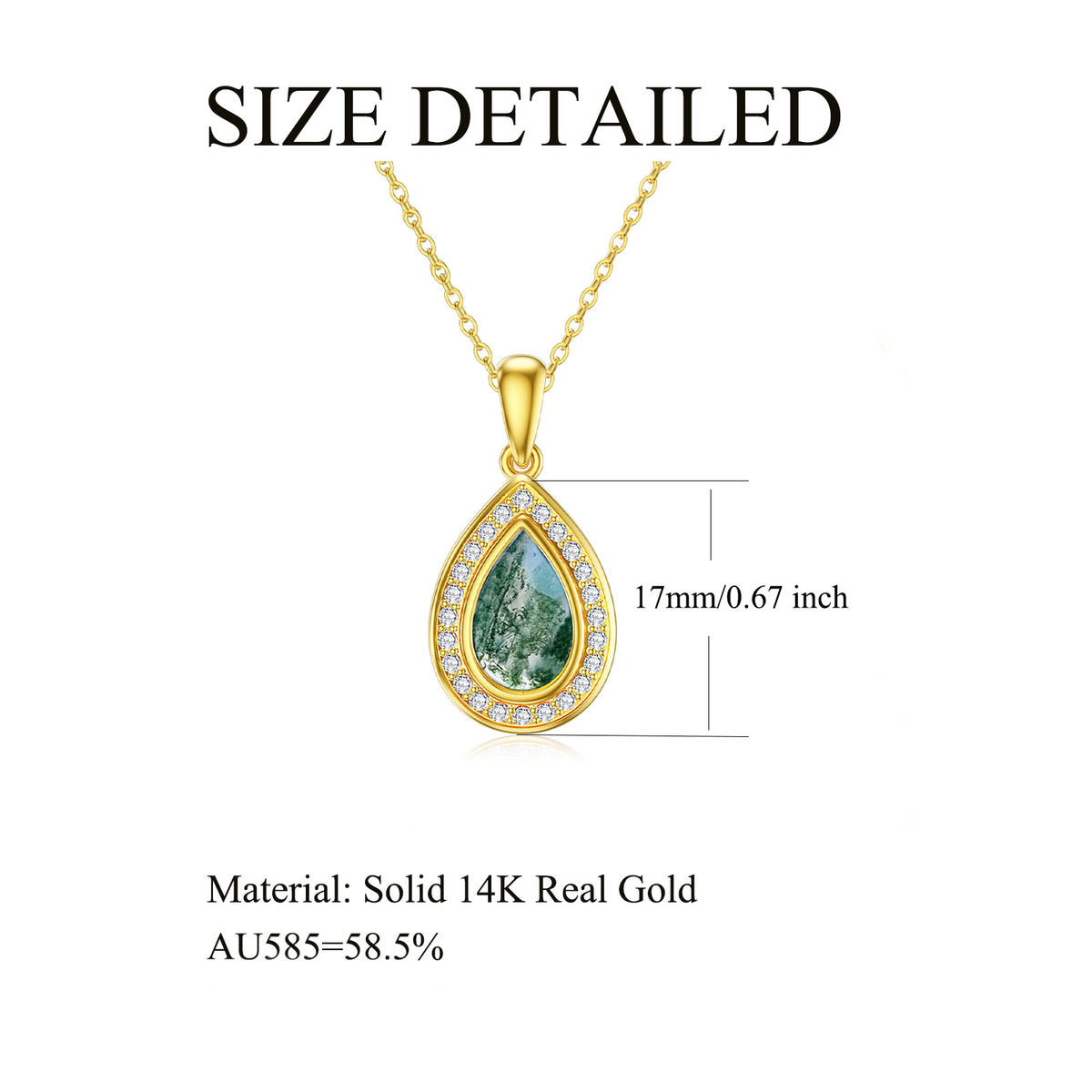 14K gold setting. Drop-shaped moss agate gemstone. Includes chain.