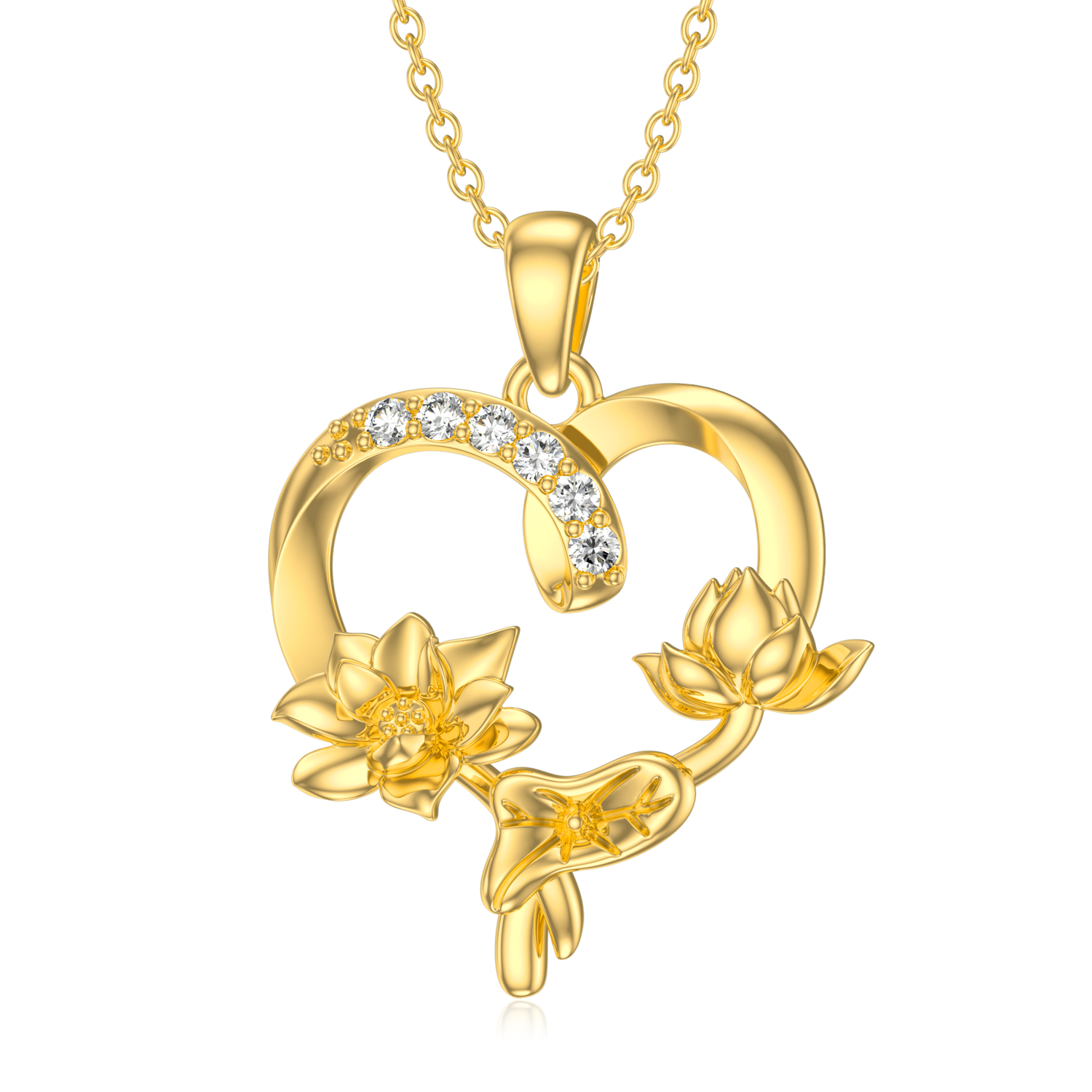 This pendant necklace is crafted from Solid 14K Gold and features intricate floral motifs (Rose, Lily, Lotus) adorned with clear Zircon stones.