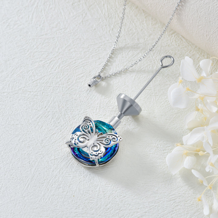 Sterling Silver Circular Shaped Crystal Butterfly Urn Necklace for Ashes