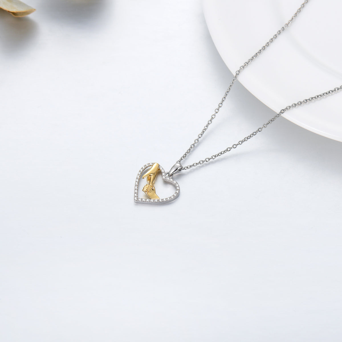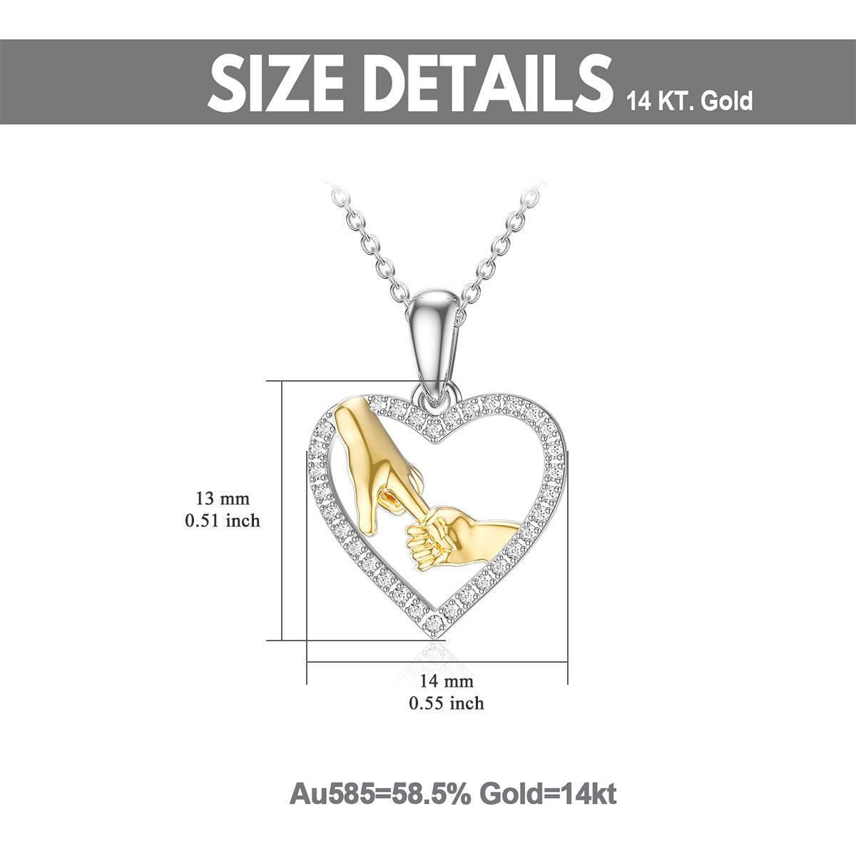 14K white & yellow gold. Round moissanite stone. Heart/holding-hands motif. 14K gold chain.