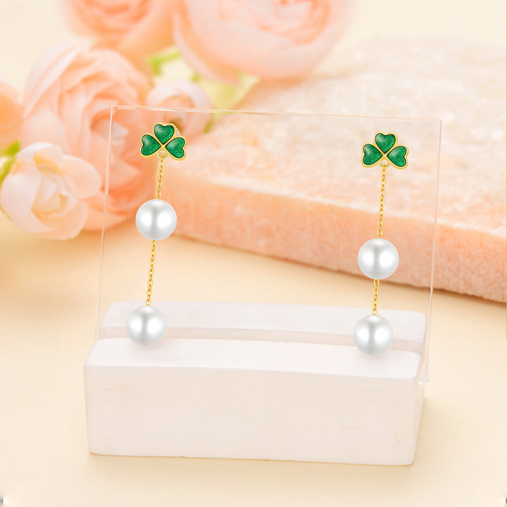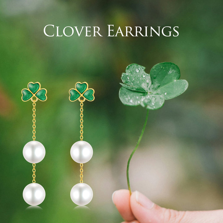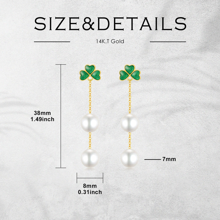 These Drop Earrings are crafted from 14K Gold, Featuring Delicate Pearls and a Charming Shamrock Design.