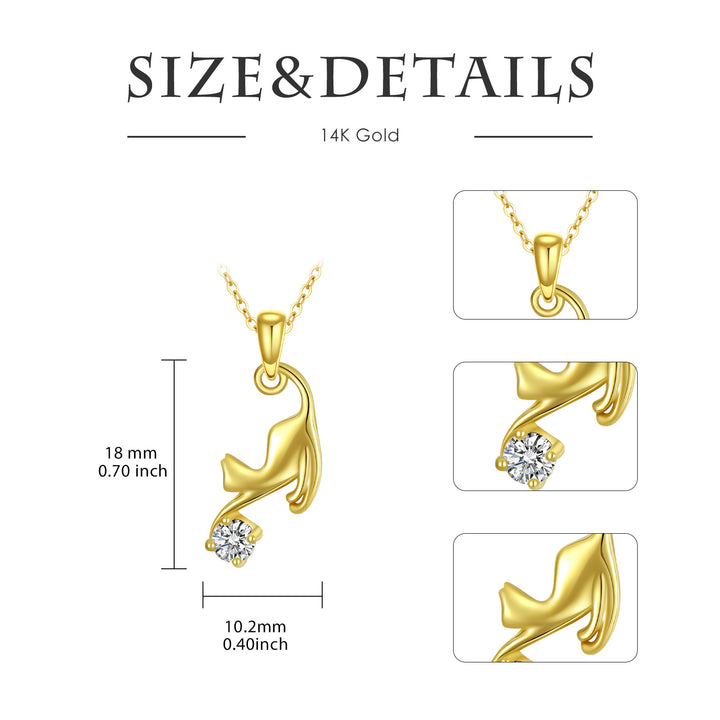 Pendant necklace crafted from solid 14K gold. Features a cat motif set with Moissanite stones. Pendant measures 0.80 inches by 0.70 inches on an 18-inch rolo chain with a spring-ring clasp.