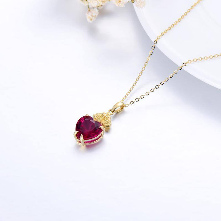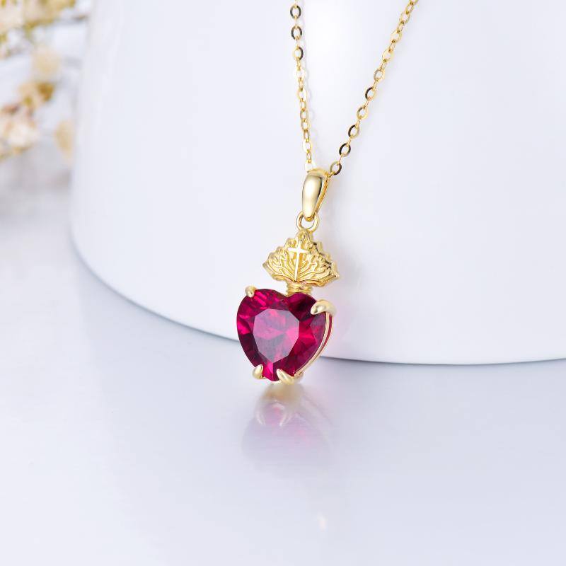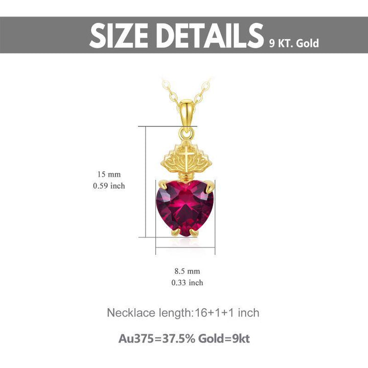 Crafted in 9K gold featuring heart-shaped pendant with red cubic zirconia accents and integrated cross motif. Includes matching chain; pendant dimensions per brand.