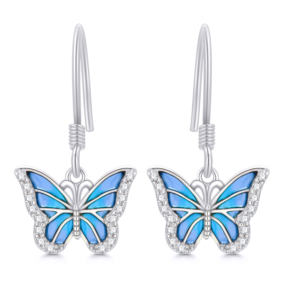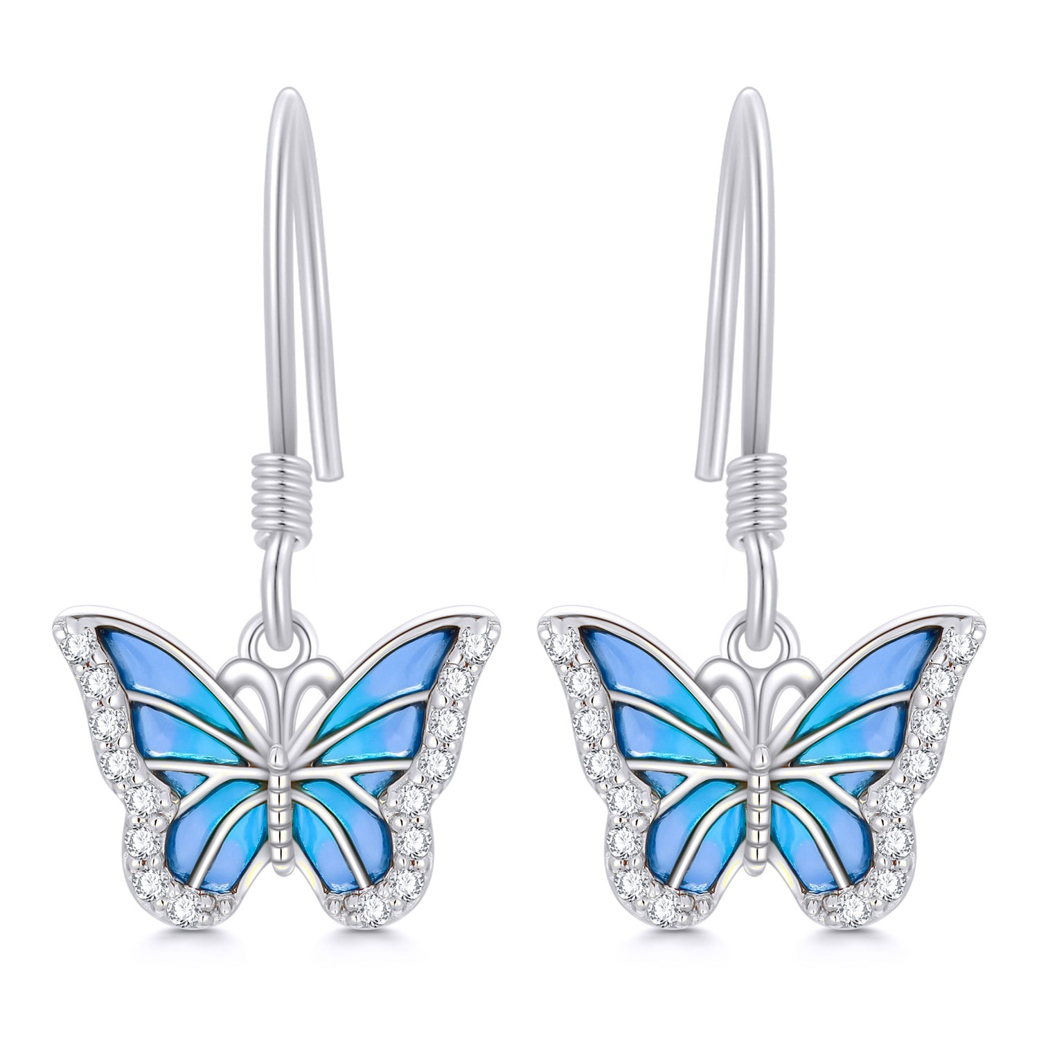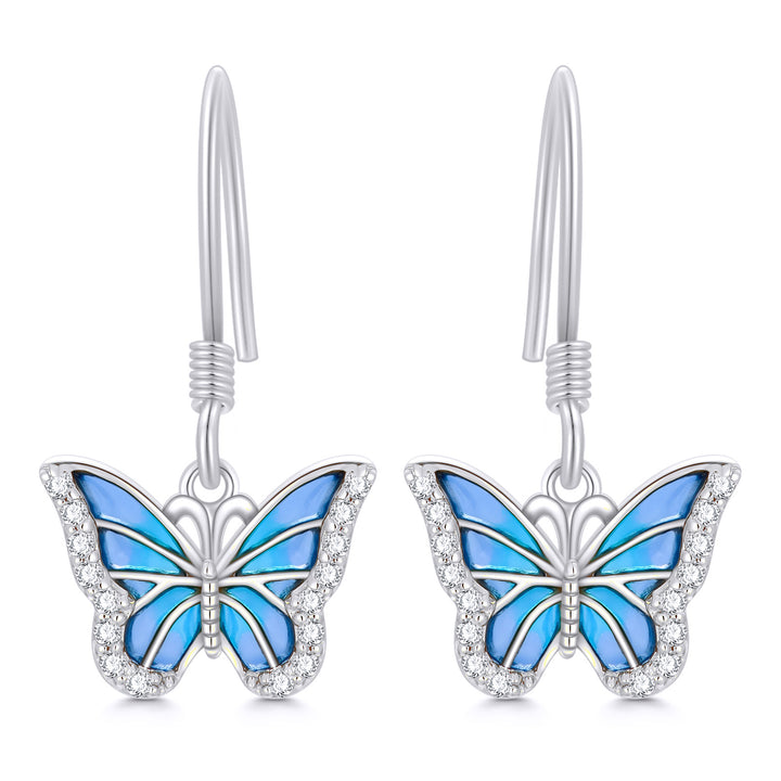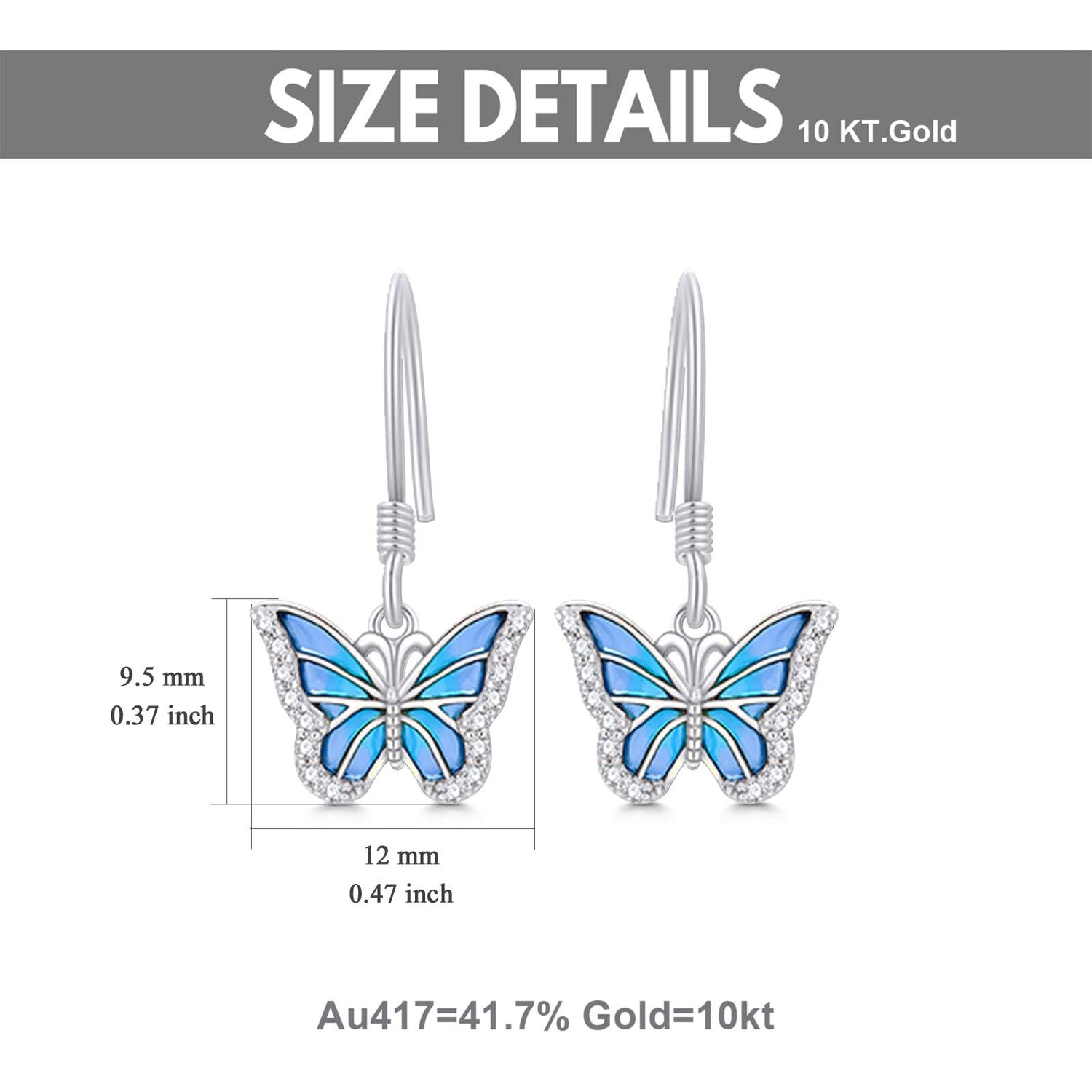 These drop earrings are made of 10K white gold and feature a delicate butterfly design embellished with brilliant moissanite gemstones, secured with standard hooks.