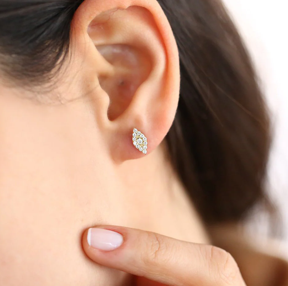 Handcrafted stud earrings made from 14K solid gold. Features an Evil Eye motif. Embellished with 0.25 CT T.W. laboratory diamonds (D color, VS clarity).