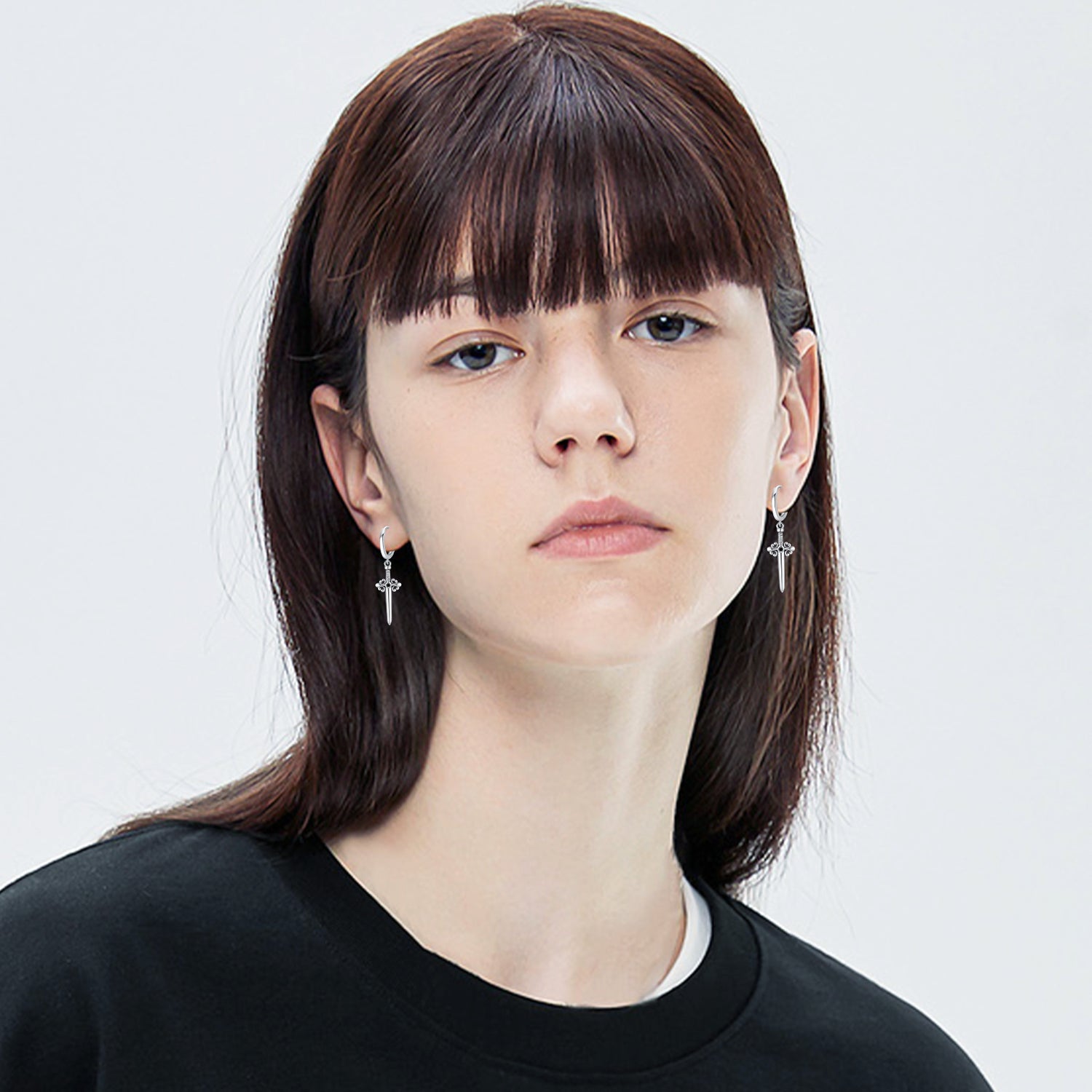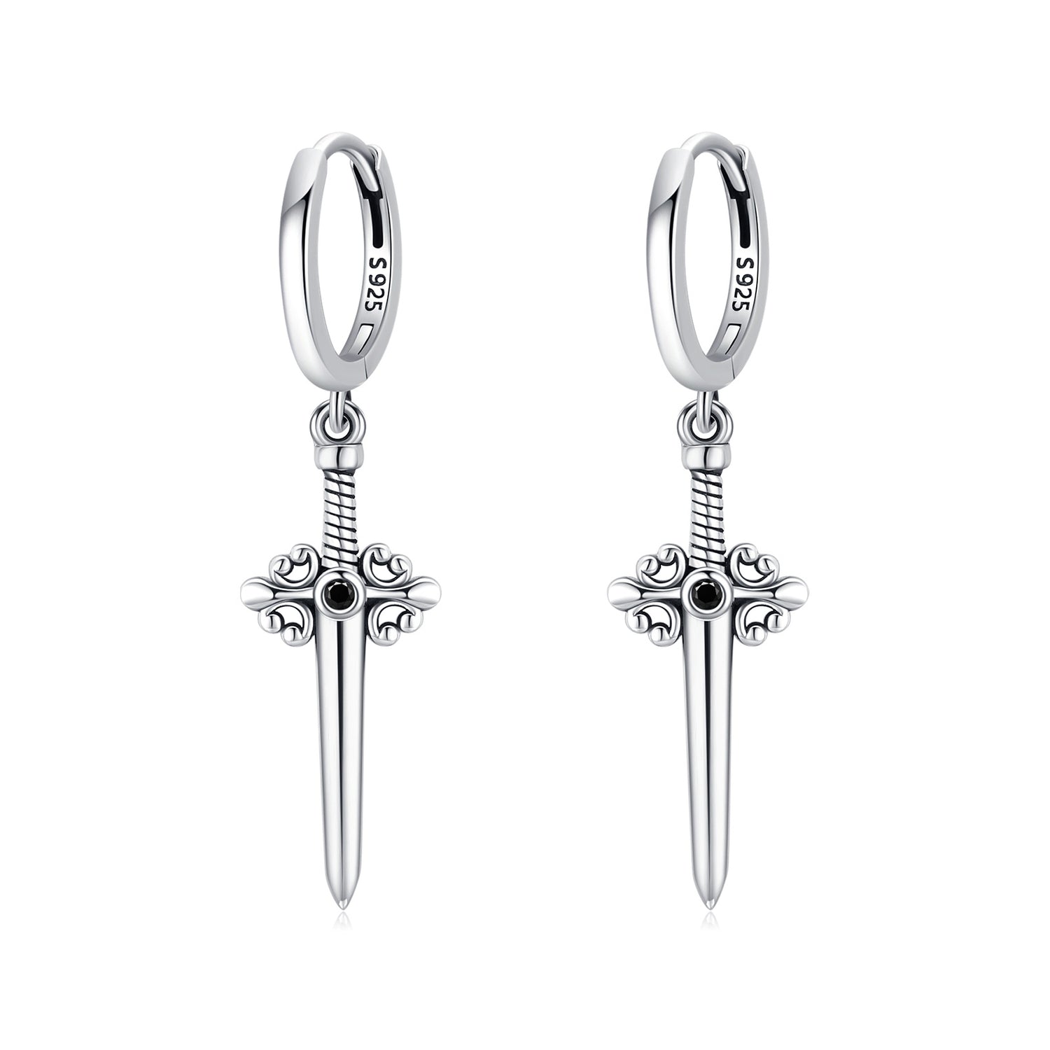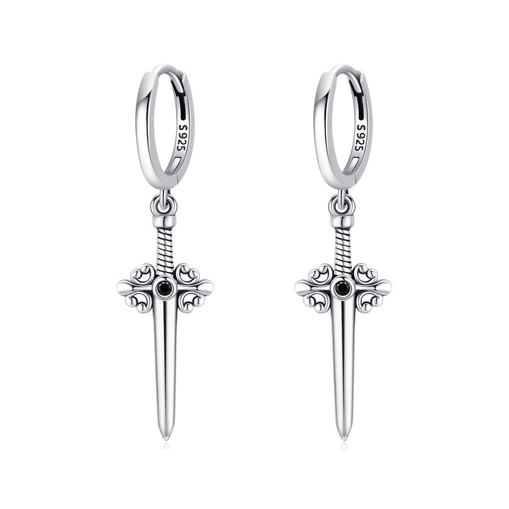 Sterling Silver Circular Shaped Cubic Zirconia Cross & Sword Drop Earrings