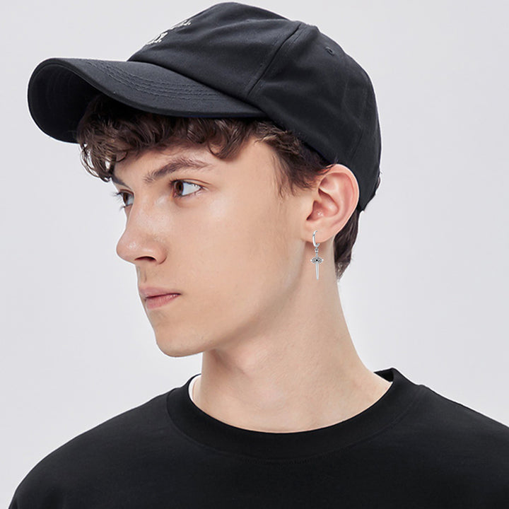 Crafted from high-quality Sterling Silver with a black finish, these circular Drop Earrings feature a Cross & Sword design with intricate Cubic Zirconia detailing.