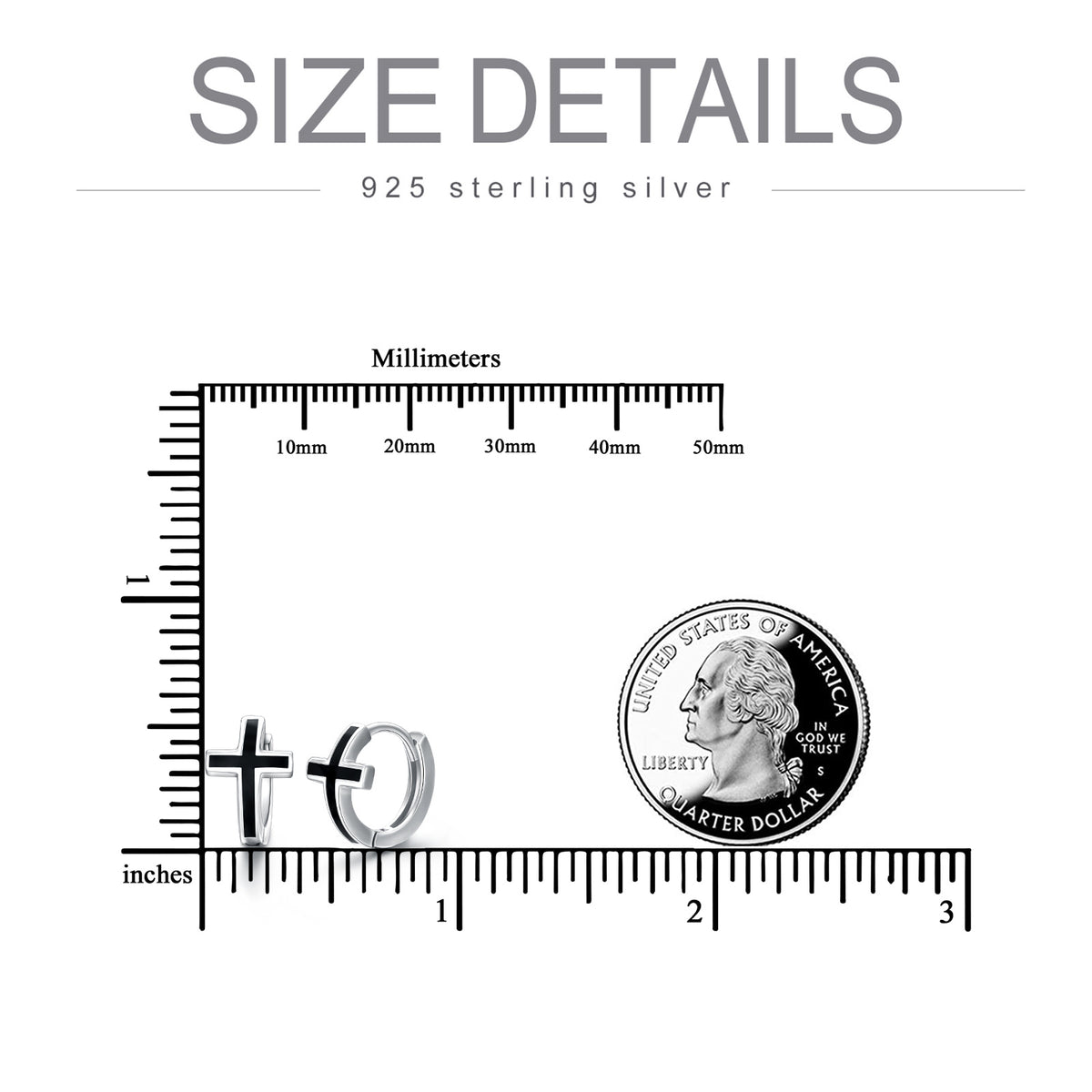 Sterling silver with white gold plating; cross hoop design; earring closures.