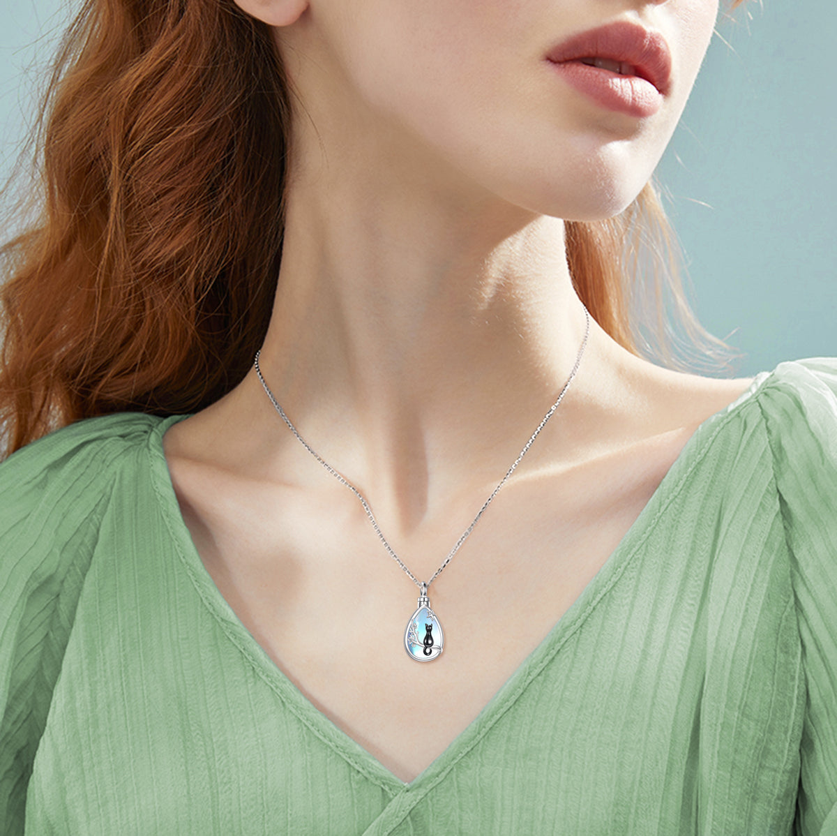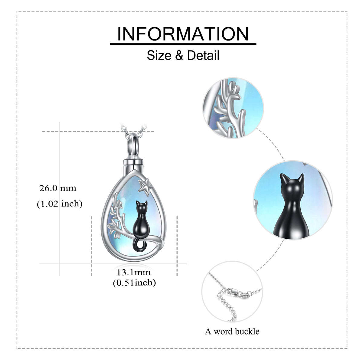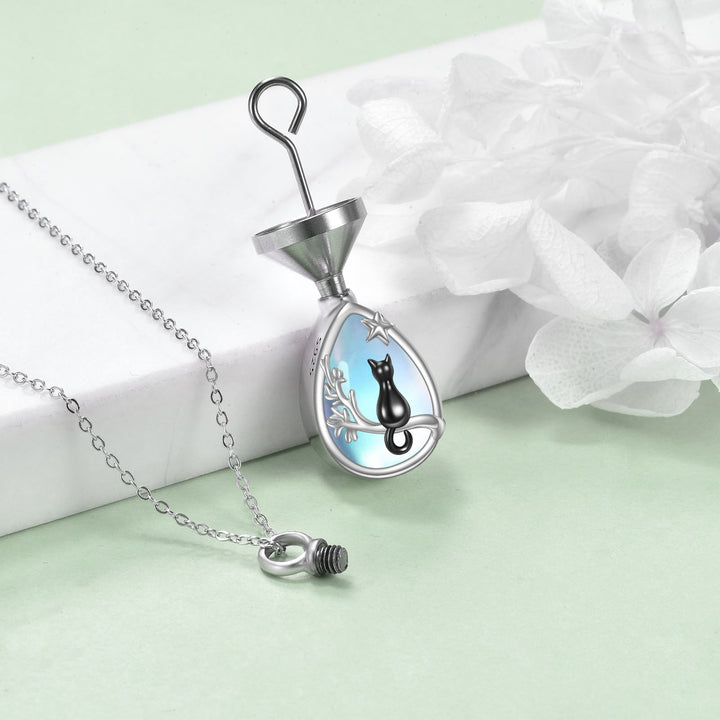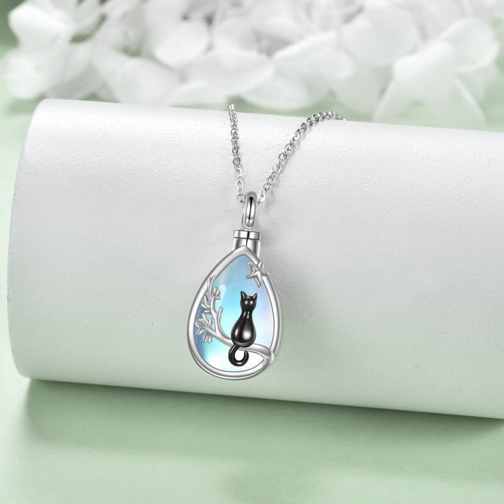 This Drop Shape Urn Necklace for Ashes is crafted from Sterling Silver with a Silver and Black Finish, featuring a Pear-Shaped Moonstone and a delicate Cat Motif.