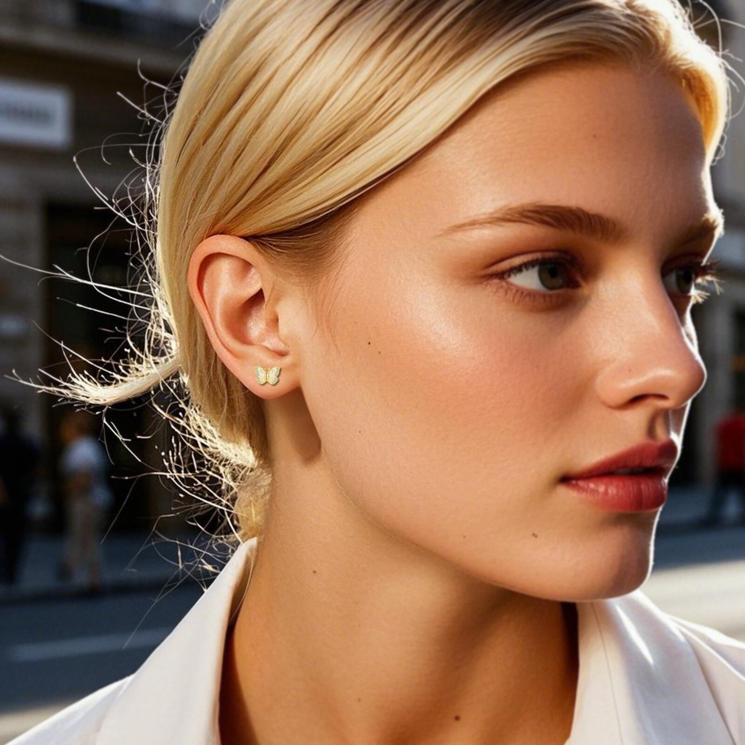 These 14K Gold Cubic Zirconia & Opal Butterfly Stud Earrings by YFN capture whimsy, brilliance, and femininity in a beautifully balanced design. Each butterfly sparkles with radiant cubic zirconia that enhance its ethereal shape, while glowing opal accents add a dreamy touch of iridescence. Ideal for women who love nature-inspired elegance, these earrings bring together sophistication and charm. Their lightweight 14K gold construction ensures lasting comfort and durability, making them perfect for both everyday style and special occasions. Delightfully expressive, they add color, meaning, and sparkle to any ensemble.