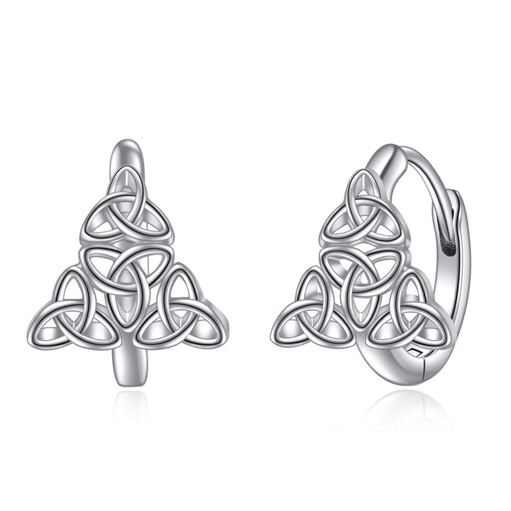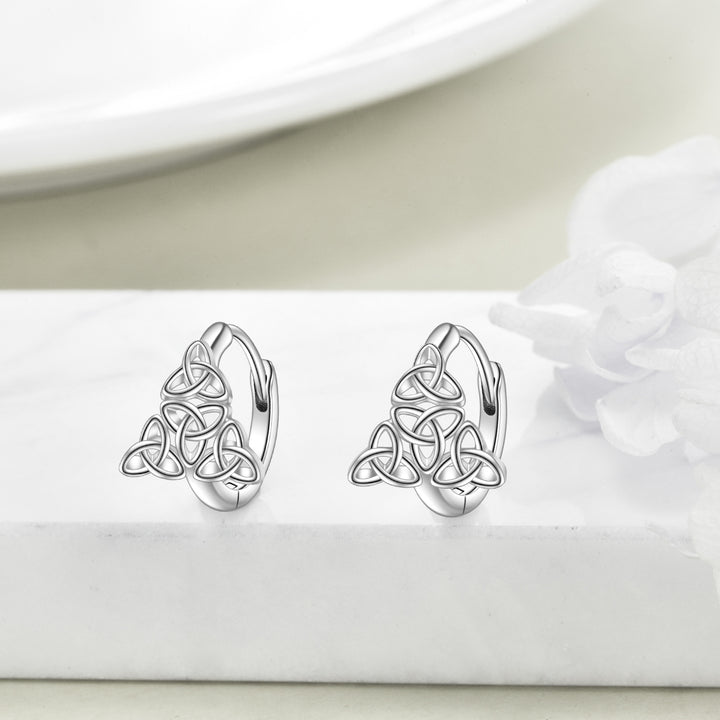 Sterling silver with white gold plating. Stone-free hoop design featuring Celtic knot motif. Dimensions per brand specifications.