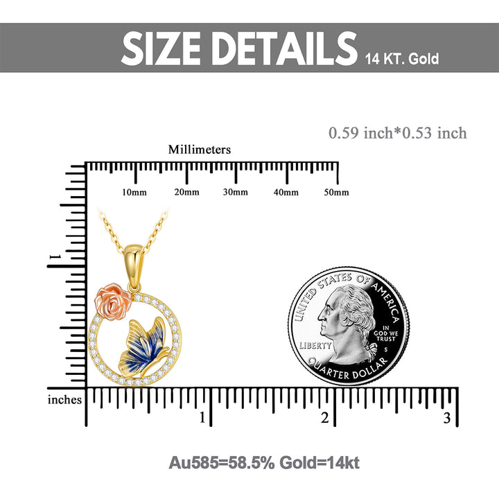 14K Gold Zircon Butterfly & Rose Pendant Necklace