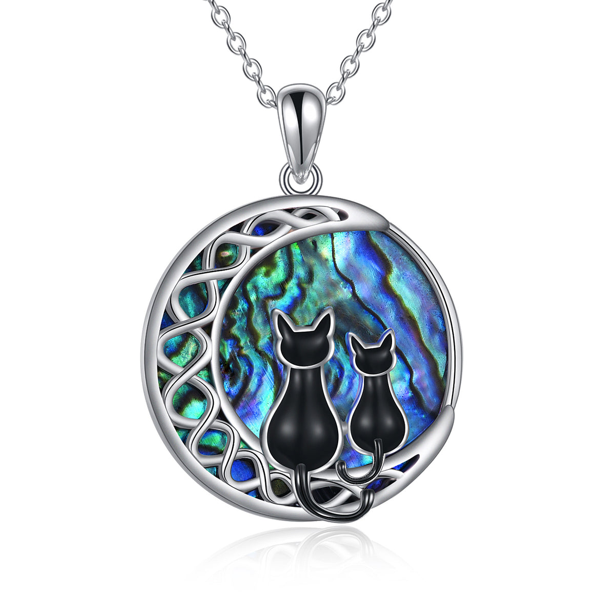 Crafted from Sterling Silver with White Gold Plating, this Round Pendant Necklace features Abalone Shellfish, and a Cat & Moon Design.