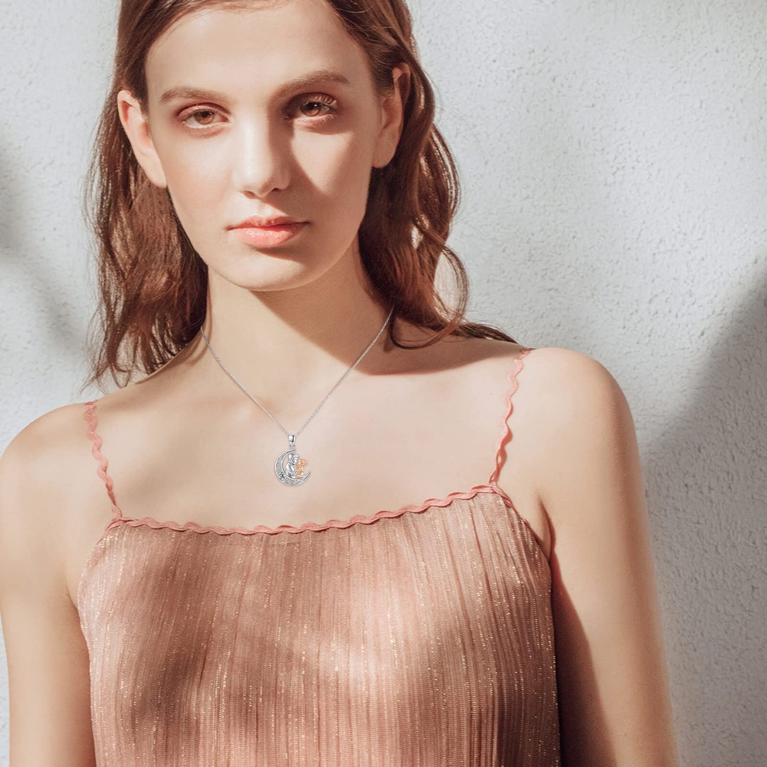 Sterling Silver Two-Tone Circular Cubic Zirconia Father & Daughter Celtic Knot Witj Moon Pendant Necklace For Women
