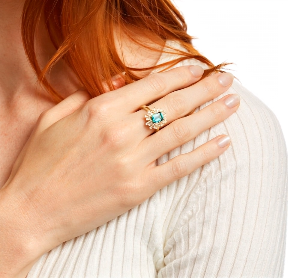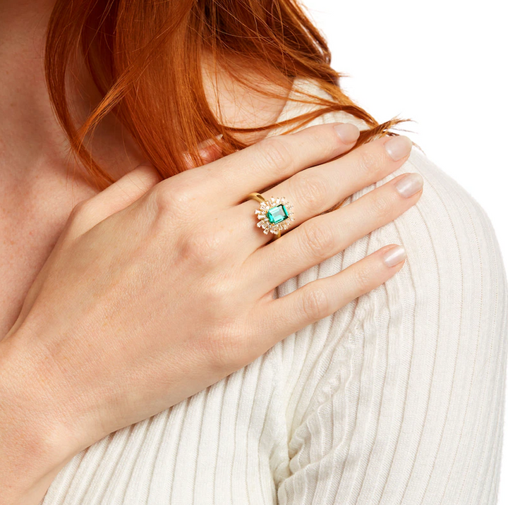This Emerald Cut Emerald & Diamond Starburst Frame Engagement Band by YFN is a stunning display of luxury and modern design. Set in 10K gold, the halo-style band features a large lab-created emerald center stone, framed by a starburst of sparkling lab-created diamonds (D color, VVS-VS clarity). With exceptional polish, cut, and symmetry (EX), this ring embodies timeless elegance and sophistication, making it a captivating and sustainable choice for the modern woman.
