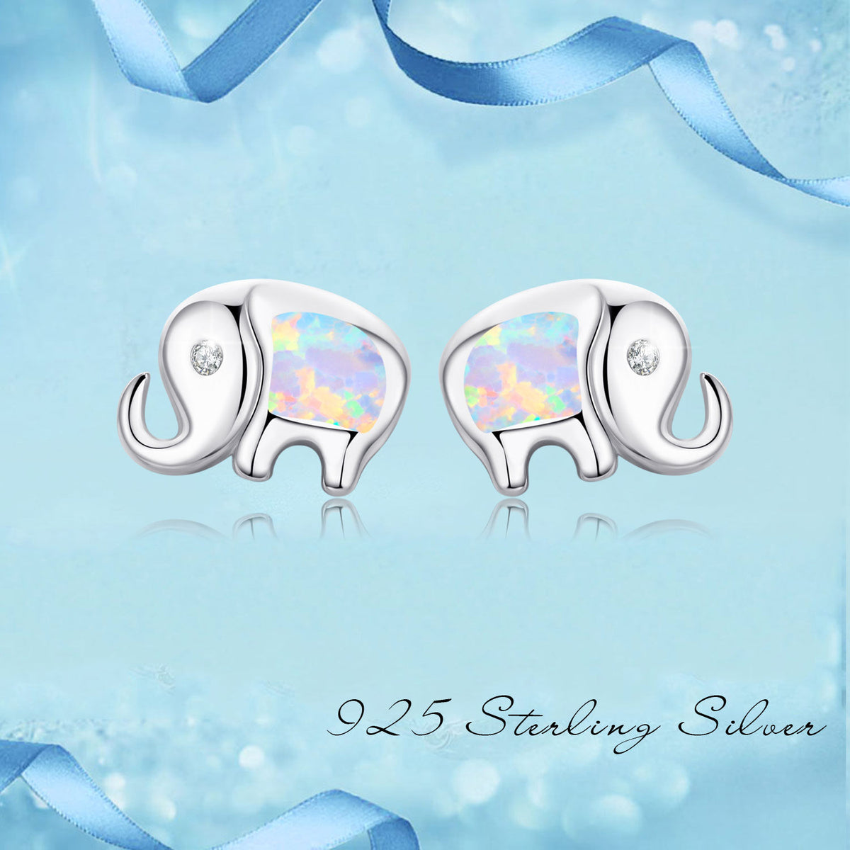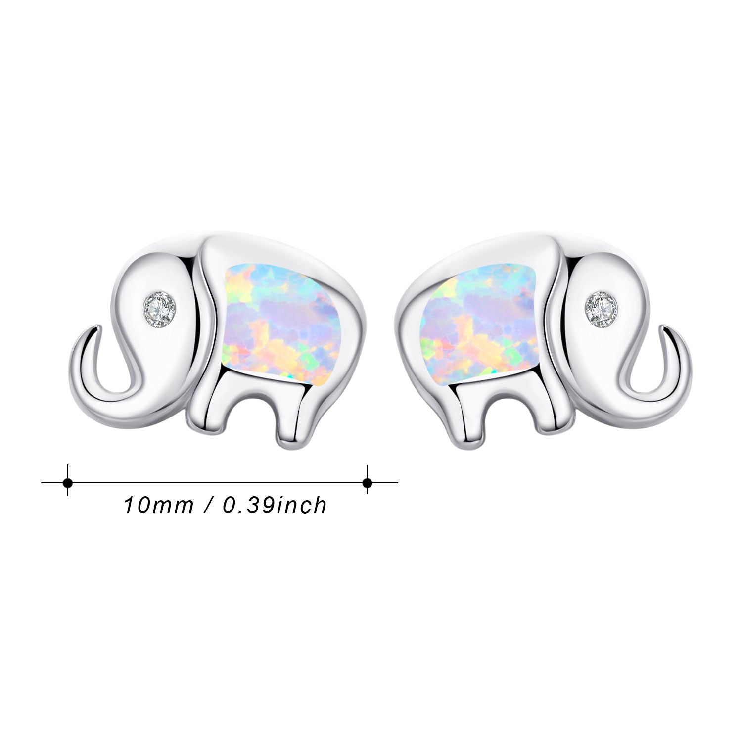 These stud earrings are crafted from Solid 925 Sterling Silver, finished with White Gold Plating, and feature an Elephant motif set with Cubic Zirconia and an Opal gemstone.