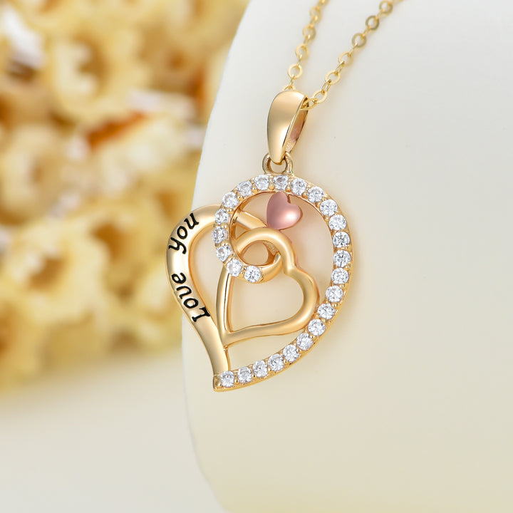 This 14K Gold Two-Tone Zircon Heart With Heart Pendant Necklace With Engraved Word by YFN is a radiant expression of romance, featuring a shimmering zircon heart framed by a second heart motif for added depth and elegance. Available in classic gold and warm rose gold tones, the pendant is beautifully inscribed with “I Love You,” creating a meaningful keepsake for women who appreciate jewelry that speaks from the heart.