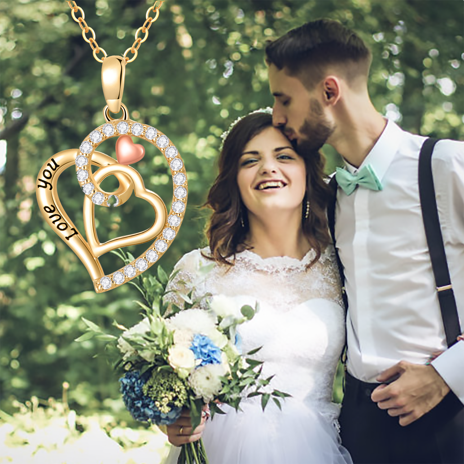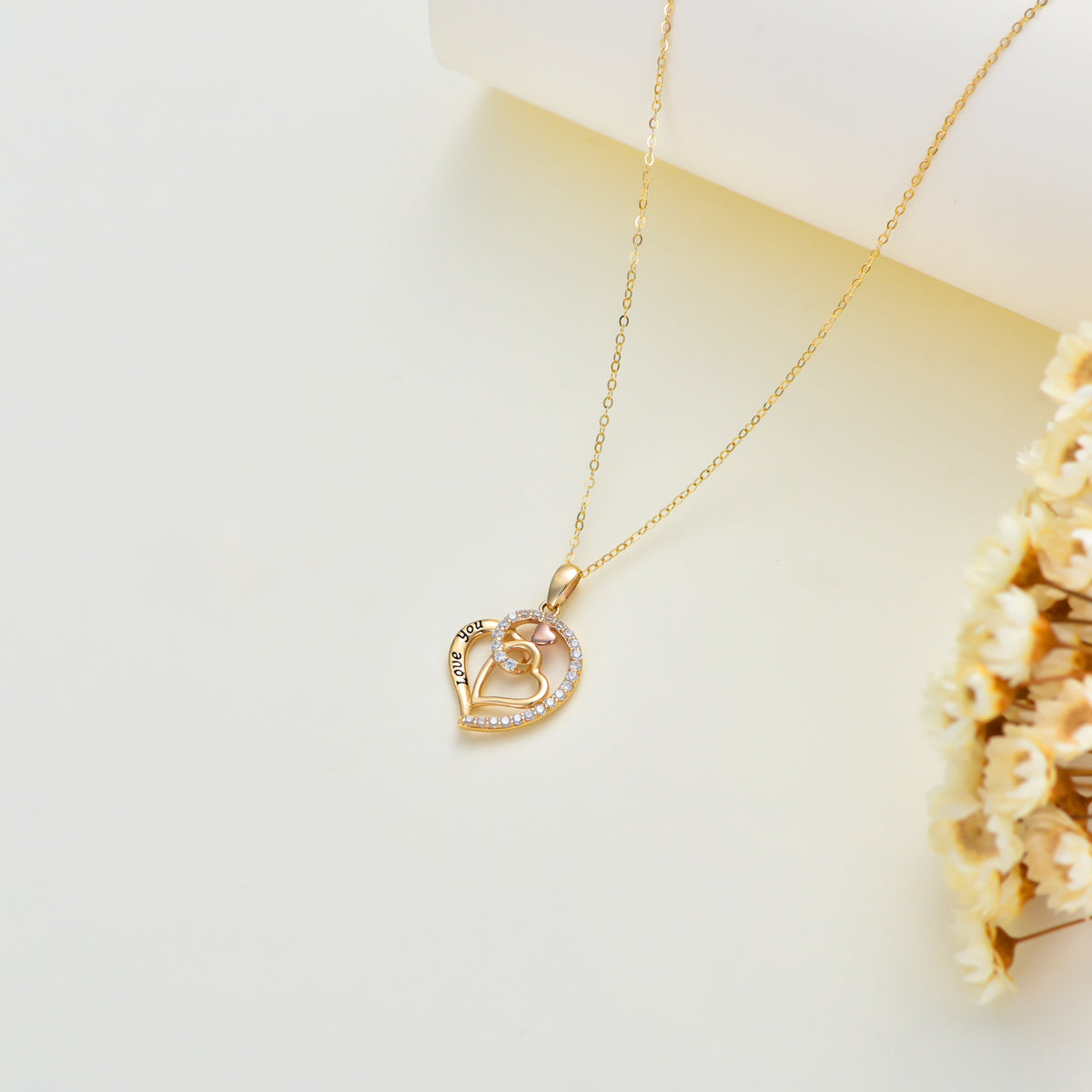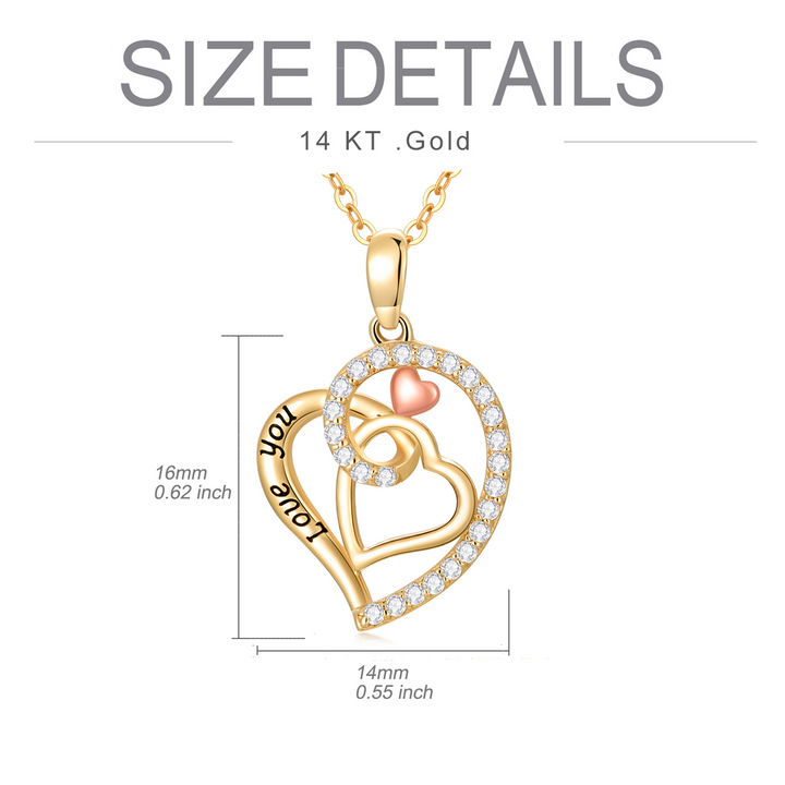 14K Gold Two-Tone Zircon Heart With Heart Pendant Necklace With Engraved Word For Women